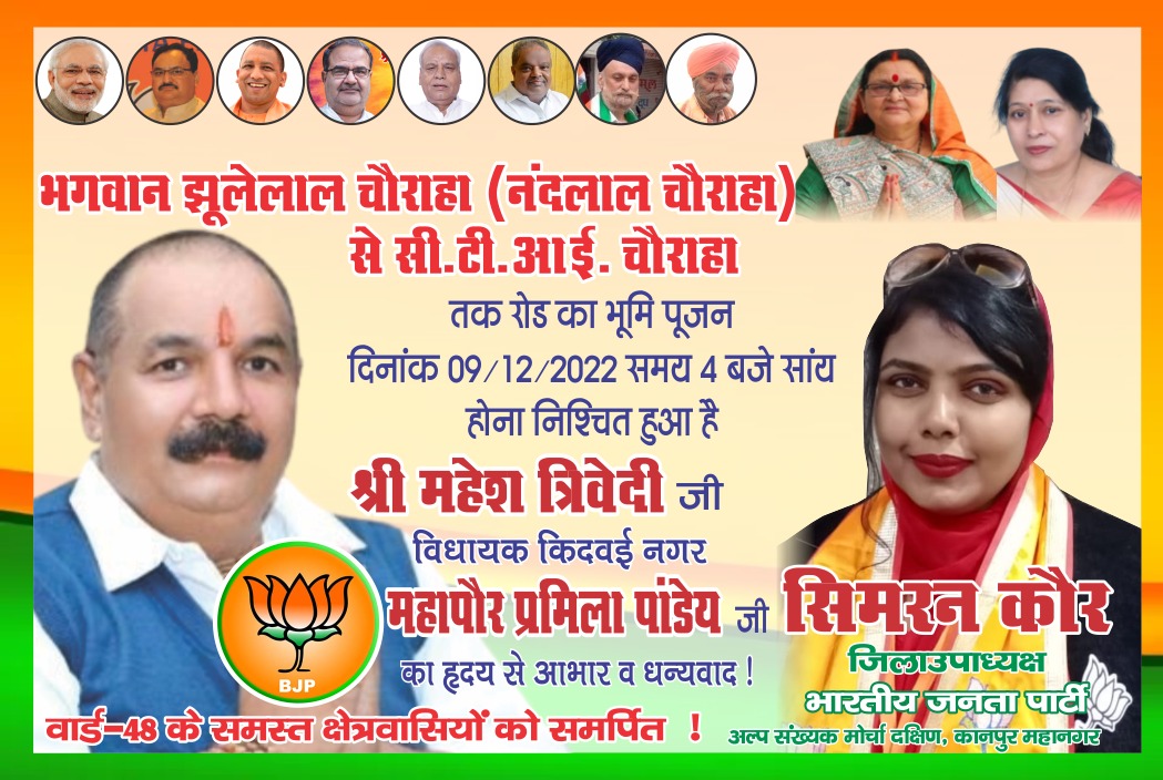 भारतीय जनता पार्टी की जिला उपाध्यक्ष अल्पसंख्यक मोर्चा एवं सुख सिमरन शक्ति फाउंडेशन ऑफ इंडिया की अध्यक्ष एवं संस्थापक श्रीमती सिमरन कौर ने बताया कि आज शाम 4 बजे नंदलाल चौराहे से आईटीआई चौराहे तक जाने वाली गोविंद नगर की सड़क जिसका कि कई वर्षों से कोई भी कार्य नहीं कराया गया सड़क पर बड़े-बड़े गड्ढे हो चुके थे आए दिन वहां पर दुर्घटनाएं हुआ करती हैं जिससे कि वहां पर चलने वाले नागरिकों को बहुत ही तकलीफ होती है इसी सड़क का भूमि पूजन महापौर श्रीमती प्रमिला पांडे जी एवं हम सबके प्रिय विधायक किदवई नगर विधानसभा के हमारे बड़े भाई श्री महेश त्रिवेदी जी के कर कमलों द्वारा किया जा रहा है आप सभी जनमानस से अनुरोध है कि ज्यादा से ज्यादा संख्या में आकर इस भूमि पूजन में अपनी सहभागिता दर्ज करें।
