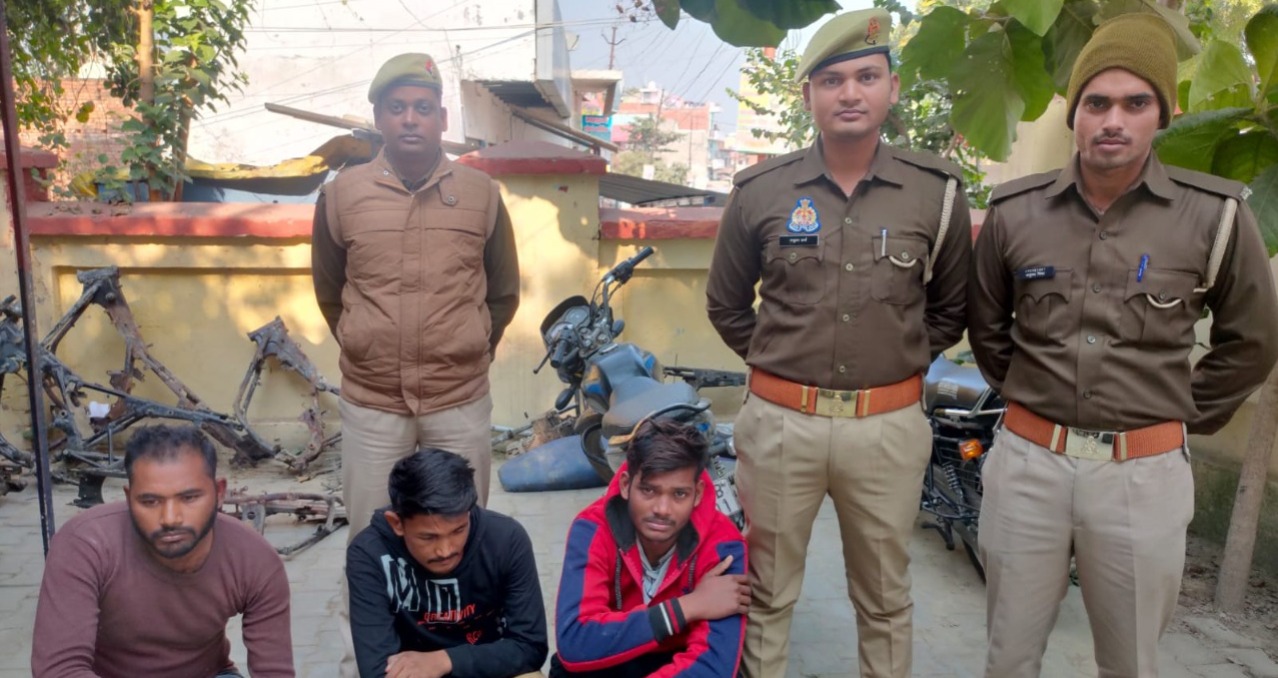 श्री अजय साहनी, वरिष्ठ पुलिस अधीक्षक जौनपुर के द्वारा जनपद में अपराध की रोकथाम व अभियुक्तों की गिरफ्तारी हेतु चलाएं जा रहे अभियान के क्रम में अपर पुलिस अधीक्षक नगर जौनपुर के निर्देशन व क्षेत्राधिकारी नगर के पर्वेक्षण में थानाध्यक्ष लाइन बाजार मय हमराह के साथ पैदल गस्त में मामूर होकर देखभाल क्षेत्र संदिग्ध व्यक्ति/ वाहन चेकिंग वाजिदपुर तिराहा पर चेकिंग कर रहे था कि पलिटेक्निक चौराहे की तरफ से एक मोटरसाइकिल पर सवार तीन व्यक्ति आते दिखाई दिए, जिन्हे रुकवाकर नाम पता पूछा गया। इनके पास से एक प्लैटिना गाड़ी नीले काले रंग जिसका रजिस्ट्रेशन नं UP62BU9001 तथा चेसिस नं0 MD2A76AYXKRC51546 बरामद हुआ तथा इमरान अली के जामा तलाशी से 1200 नगद प्राप्त हुआ। उक्त वाहन के सम्बन्ध में थाना लाइनबाजार में मु0अ0सं0-540/22 धारा-379 भादवि पंजीकृत है। पूछताछ पर ज्ञात हुआ कि तीनों मिलकर मोटरसाइकिल चुराते हैं तथा चोरी की दो वाहन मंगेश यादव के घर पर रखी है। पुलिस टीम मंगेश यादव के घर पर आकर चेक की तो दो वाहन मिला एक वाहन की संख्या UP70 AM 3631 अंकित है चेचिस नंबर को मिटा दिया गया है व इंजन न JA05EGJ9F00014 अंकित है। दूसरी TVS अपाचे लाल रंग जिसका रजिस्ट्रेशन नंबर MP36MQ3548 चेचिस नंबर D634CE4XK2L00661 अंकित है । इसके अलावा पास में ही एक नंबर प्लेट मिला जिस पर UP62BH9121 अंकित है । बरामदशुदा नम्बर प्लेट के सम्बन्ध में थाना लाइनबाजार में मु0अ0सं0 391/22 धारा 379 IPC पंजीकृत है। पकङे गये व्यक्तियों को उनके अपराध का बोध कराकर पुलिस हिरासत में लिया गया तथा बरामद माल को कब्जा पुलिस में लिया गया।