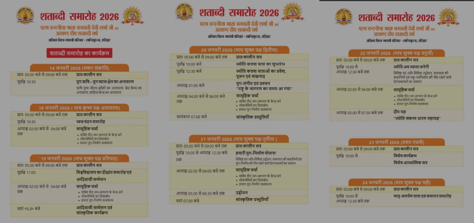 हरिद्वार : अखिल विश्व गायत्री परिवार शान्ति कुंज हरिद्वार द्वारा शताब्दी समारोह 2026 का भव्य आयोजन किया जा रहा है जिसमें शताब्दी समारोह के रूप में मनाया जाएगा यह आयोजन दिनांक 14 जनवरी से शुरू होकर दिनांक 24 जनवरी 2026 तक चलेगा जिसमें सभी शांति कुंज से जुड़े हुए गुरु भाई बहनों से अपील है कि निर्धारित कार्यक्रम का विवरण चार्ट जनहित में प्रकाशित किया गया है समय और कार्यक्रम की जानकारी कर लाभ उठाएं