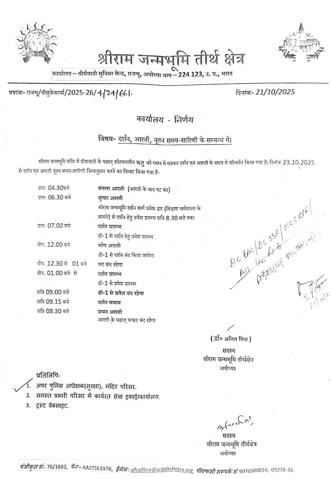 अयोध्या: श्री राम मंदिर में आज से श्रद्धालुओं को मंदिर में सुबह 7:00 से होंगे रामलला के दर्शन। रात 9:00 बजे तक जारी रहेगा दर्शन पूजन। रामलला की आरती के समय में भी हुआ बदलाव,दोपहर में आरती व भोग के लिए एक घंटे तक मंदिर का पट रहेगा बंद।देखे समय सारिणी