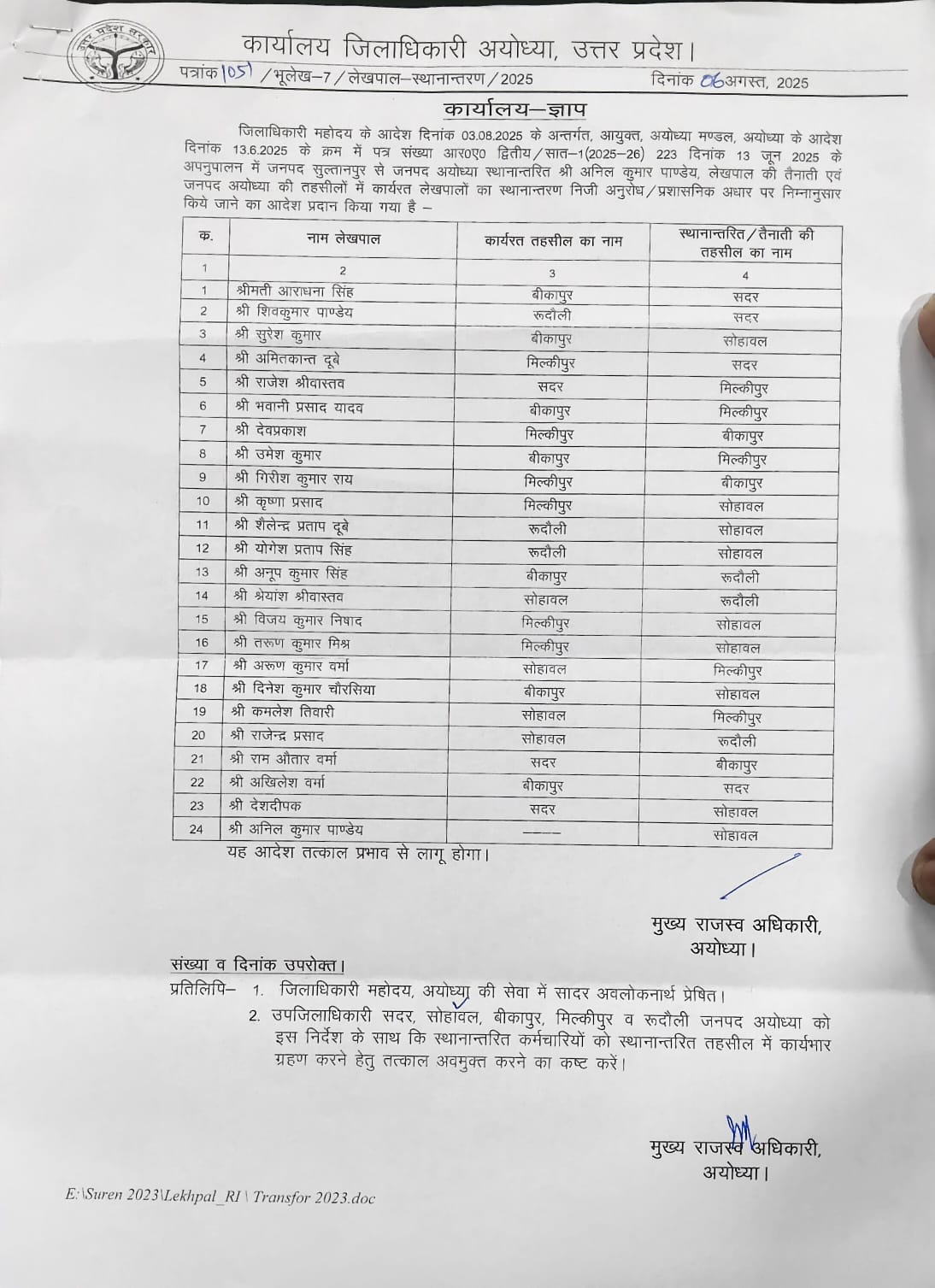 अयोध्या में 24 लेखपालों के कार्य क्षेत्र में डीएम के आदेश पर मुख्य राजस्व अधिकारी ने किया फेरबदल करने का आदेश