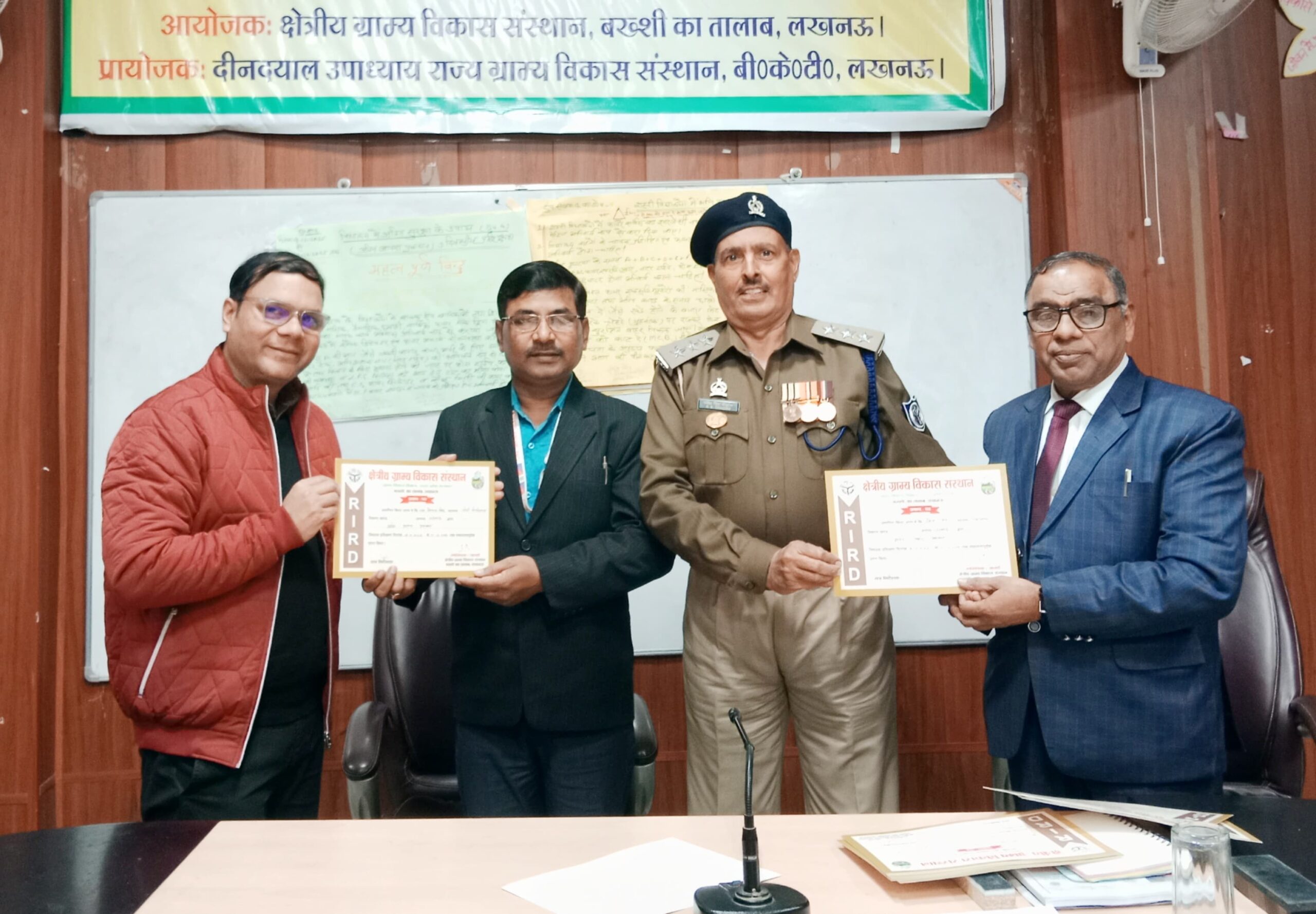 नागरिक सुरक्षा विभाग द्वारा नामित प्रशिक्षार्थी डिविजनल वार्डेन रमेश सिंह चौहान, डिप्टी डिविजनल वार्डेन रामगोपाल सिंह, वार्डेन अभिनव खंडेलवाल को प्रशिक्षण सम्पन्न अवसर पर आचार्य वरुण चतुर्वेदी ने प्रमाण पत्र प्रदान किया, अवसर पर डॉ. अरुण, वी.के. सिंह आदि प्रमुख मौजूद रहें।