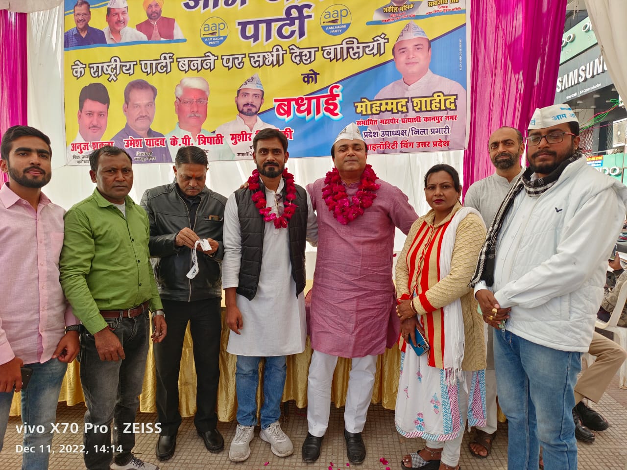 कानपुर। स्वतंभ भारत के राजनीतिक इतिहास में सबसे कम समय 10 वर्ष में राष्ट्रीय पार्टी बनने वाली आम आदमी पार्टी पांच वर्षों में भारत की मुख्य राजनीतिक पार्टी बनेगी। यह वात आज पार्टी के जिला अध्यक्ष उमेश माछ ने एक कार्यक्रम में कही। पार्टी कार्यकर्ता व नेता परेडपर पार्टी के राष्ट्रीय दर्जा पाने पर खुशी का इजहार मिठाई बाँट कर कर रहे थे। अनुसूचित जाति प्रकोष्ठ के अध्यक्ष पूर्व विधायक महेश बाल्मीकि ने कहा कि कानपुर में महापौर सहित अधिक से अधिक पार्षद जिला कर कानपुर से देश को सन्देश देना है कार्यक्रम में मुख्य रूप से जिला महासचिव के यी भिपाठी, अल्पसंख्यक प्रकोष्ठ के प्रदेश उपाध्यक्ष मो० घर, प्रदेशसचिव मुशीर शाहिद सिद्धि की, जिला प्रभारी अनुज शुक्ला, व्यापार प्रकोष्ठ के सचिव संदीप शुक्ला, युवा प्रकोष्ठ के प्रदेश उपाध्यक्ष योगेश दीक्षित, सच्छि मुकेश झा, कृष्णा प्रजापति, पुष्पा सिंह, सुनीता वर्मा, जयन्ती यादव, नागेन्द्र राणा, सुनील बाबू असलम मेसूरी, वसीमुद्दीन, दीव चन्द्र मादक प्रियंका सिंह, आर. एस. राजपूत, अजीत खोटे, फजलुर्रहमान, प्रशान्त शुक्ला, अश्वनी कुमार, हरीश कुमार, मो० शोएव, शहंशाह आलम, रियाज खान, मोहित शुक्ला, सैय्यद आलम, फैजान लारी सहित सैकड़ों लोग मौजूद रहे।