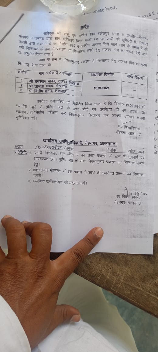 मेंहनगर (आजमगढ़ ),तहसील मुख्यालय मात्र 6 किमी0 की दूरी पर स्थित ग्राम- बलेलपुर निवासी वासू पुत्र हरगेंन की भूमिधरी गाटा सं0- 98 पर गांव के ही कुछ लोगो द्वारा अबैध कब्जा किया जा रहा था ,जिसकी शिकायत आवेदक ने एसडीएम रामानुज शुक्ल से की प्रकरण को गम्भीरता से लेते हुए 9 अप्रैल 2024 को राजस्व निरीक्षक घनश्याम यादव के अलावा दो लेखपालो की टीम गठित कर 13 अप्रैल को पुलिस बल के साथ उपस्थित होकर प्रकरण का निस्तारण हेतु लिखित आदेशित किया , आदेश के बावजूद गठित टीम मौके पर आज तक नही पहुँची , जबकि शासन व प्रशासन का फरमान जारी है कि पीड़ित को त्वरित न्याय दिलाई जाए ,वही देखा जाए तो आवेदक कड़ाके की धूप व हवा की थेपडो में तहसील मुख्यालय का प्रतिदिन चक्कर लगा रहा हैं।