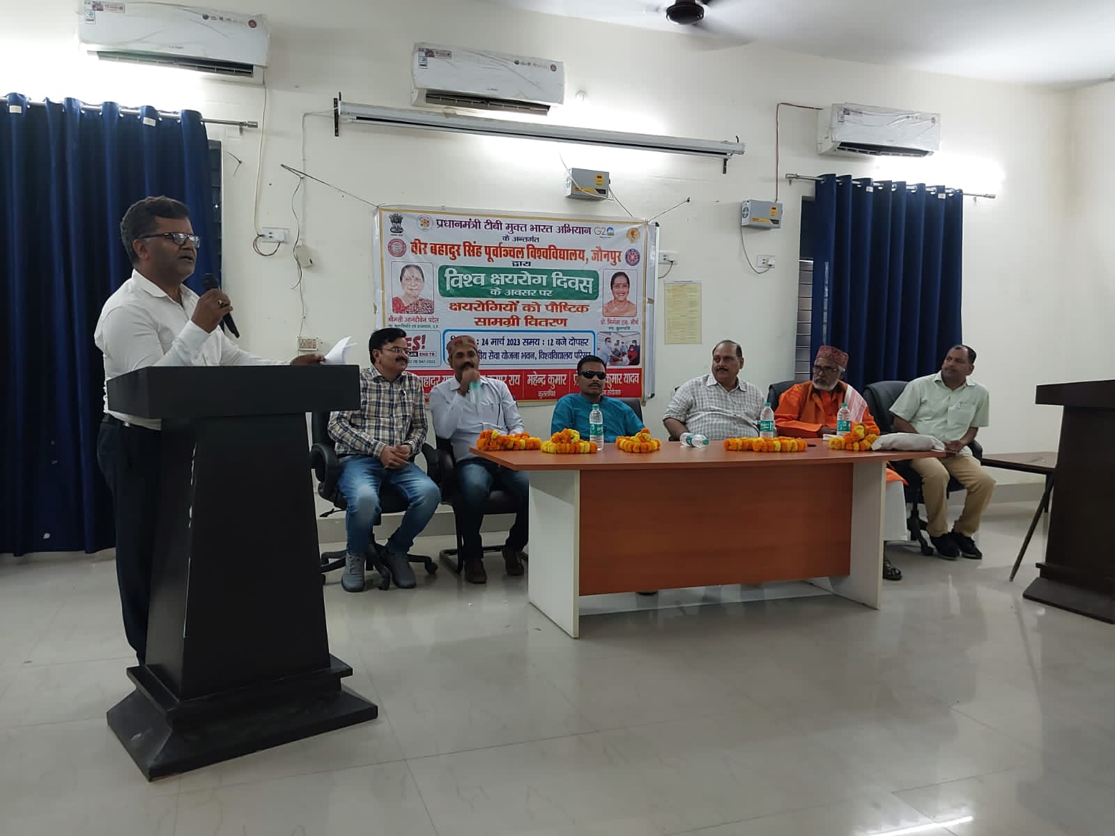जौनपुर। वीर बहादुर सिंह पूर्वांचल विश्वविद्यालय, जौनपुर में कुलाधिपति एवं राज्यपाल, उत्तर प्रदेश श्रीमती आनंदीबेन पटेल के निर्देश पर एवं कुलपति प्रो. निर्मला एस.मौर्य के संरक्षकत्व में विश्व क्षयरोग दिवस के अवसर पर विश्वविद्यालय परिसर स्थित राष्ट्रीय सेवा योजना भवन सभागार में क्षयरोग जागरूकता एवं पोषण सामग्री वितरण कार्यक्रम का आयोजन किया गया। इस कार्यक्रम में मुख्य अतिथि कुलसचिव महेंद्र कुमार ने लोगों को संबोधित करते हुए कहा क्षयरोग उन्मूलन अभियान में पूर्वांचल विश्वविद्यालय बढ़-चढ़कर प्रतिभाग कर रहा है एवं प्रधानमंत्री जी के 2025 तक भारत को क्षयरोग से मुक्त करने के अभियान में कदम से कदम मिलाकर अपना योगदान देने के लिए तत्पर है। अध्यक्षीय उद्बोधन में वित्त अधिकारी संजय कुमार राय ने कहा क्षय रोगी समय पर दवा और पोषण लेते रहें जिससे वे शीघ्र ठीक हो सकें । सामुदायिक स्वास्थ्य केंद्र करंजाकला के एमओआईसी डॉ अरुण कुमार ने क्षयरोगियों को क्षयरोग के विभिन्न लक्षणों के बारे में विस्तार से बताया। कार्यक्रम का संचालन प्रो.राकेश कुमार यादव ने किया तथा धन्यवाद ज्ञापन कार्यक्रम समन्वयक डॉ राज बहादुर यादव ने किया। इस कार्यक्रम में करंजाकला, सदर और शाहगंज ब्लॉक के क्षयरोगियों सुनील वर्मा, आशीष प्रजापति, चंदा गुप्ता , मोलाई गौतम, रीना राजभर, कुलदीप चौहान, सुमित्रा यादव, चौधरी यादव, मीना निषाद आदि को पौष्टिक पोटली का वितरण कुलसचिव और वित्त अधिकारी ने किया। इस अवसर पर प्रो.बी.डी.शर्मा,डॉ श्याम कन्हैया सिंह, डॉ शशिकांत यादव, डॉ.जाह्नवी श्रीवास्तव,डॉ वनिता सिंह, डॉ अजय कुमार सिंह, डॉ अवधेश कुमार मौर्य,डॉ अरविंद कुमार यादव, डॉ विनय वर्मा ,सर्वेश कुमार यादव,ज्योति चौधरी,सौमित्र त्रिपाठी, शिवादित्य सिंह,दीपक कुमार,वरद सिंह, रविंद्र प्रजापति, नितेश कुशवाहा,शिवा सोनकर, सौरभ सिंह,निखिल शर्मा,कयामुद्दीन खान,संदीप यादव, संतोष कुमार,स्वर्णिम मिश्रा, आलोक मौर्य आदि उपस्थित रहे।