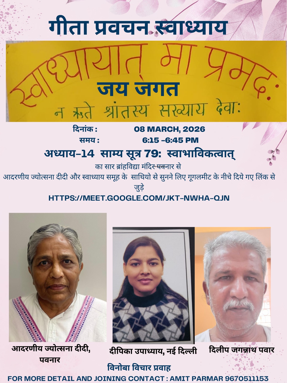 30 मिनट के इस साप्ताहिक स्वाध्याय में ब्रह्म विद्या मंदिर पवनार से आदरणीय ज्योत्सना दीदी, तथा स्वाध्याय परिवार से दीपिका उपाध्याय जी और दिलीप पवार जी द्वारा विचार प्रस्तुत किए गए। सभी वक्ताओं ने विषय को सरल और सारगर्भित ढंग से स्पष्ट किया।