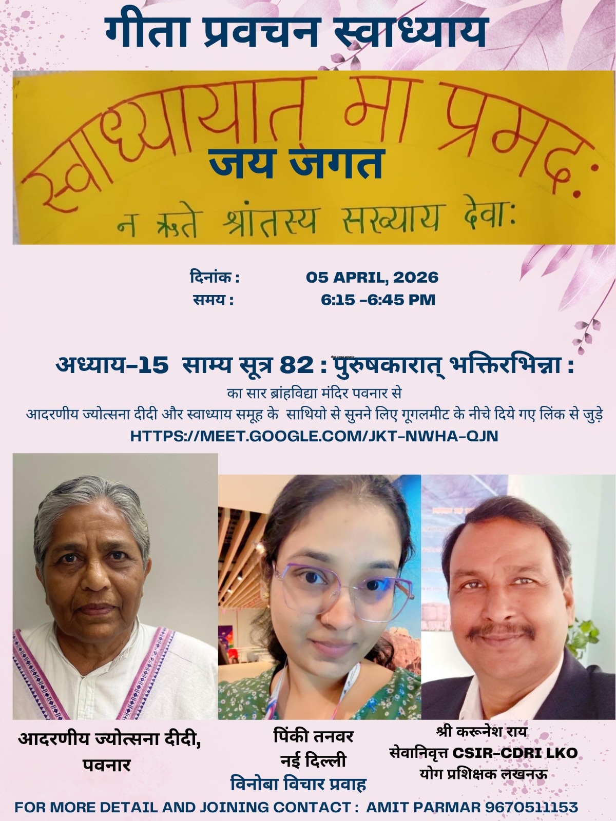 यह साप्ताहिक स्वाध्याय प्रत्येक रविवार सायं 6:15 से 6:45 बजे ऑनलाइन आयोजित होता है। स्वाध्याय से जुड़ने के इच्छुक व्यक्ति मोबाइल नंबर 9670511153 अथवा ईमेल amitparmar47@gmail.com
