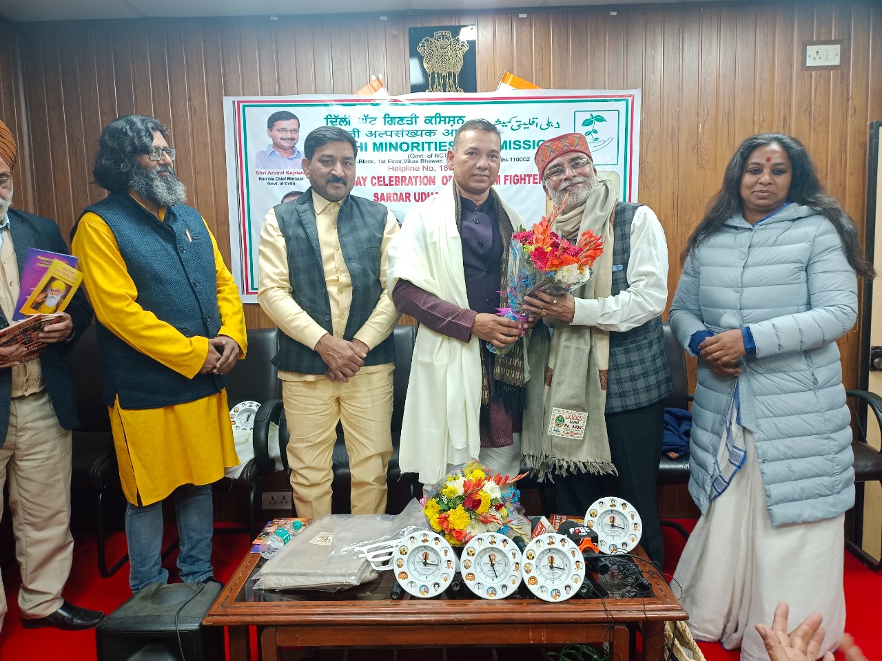 दिल्ली अल्पसंख्यक आयोग के चेयरमैन जाकिर खान जी की अध्यक्षता में आयोग के सदस्य बिंद्रा जी और नैंसी जी के सहयोग से सभा का आयोजन किया गया राजीव जोली खोसला ने चार साहिब जादों को किया नमन और शहीद उधम सिंह जी को दी पुष्पांजलि और बताया कि सिखों की कुर्बानी की अनेकों गाथाएं संसार के लिए अहम हैं जिसमें गुरु गोबिंद सिंह जी के चार पुत्र, अजित सिंह, जुझार सिंह, जोरावर सिंह और फतेह सिंह ने मुगलों के खिलाफ एक महत्वपूर्ण लड़ाई में अपने जीवन का बलिदान दिया था। आज हम सबको नमन करते हैं और आज शहीद उधम सिंह जी के 124वें जन्म दिवस के अवसर पर आयोग के सभागार में सभी राष्ट्रभक्तों ने पुष्पांजलि अर्पित की, उधम सिंह जी ने 1919 जलियांवाला बाग नरसंहार का बदला 1940 में जनरल डायर को लंदन में मार कर लिया था, सिखों को यह प्रेरणा अपने गुरु की कुर्बानी से ही मिली कार्यक्रम में विशिष्ट अतिथि आदरणीय राज त्रिपाठी जी क्रांतिकारी शहीद जमुना प्रसाद त्रिपाठी जी के पोते जो पिछले 51 वर्षों से उत्तर प्रदेश मैनपुरी में शहीदी मेले का आयोजन कर रहे हैं जो एक ऐतिहासिक मेला होता है! कार्यक्रम में उपस्थित नशा मुक्ति जागरूकता अभियान के संस्थापक सुशील खन्ना जी जो भारत को नशा मुक्त बनाने के लिए अथक प्रयास कर रहे हैं, कार्यक्रम में उपस्थित साध्वी रेणुका शर्मा जी, जो पिछले काफी समय से गौरक्षा पर आंदोलन कर रही हैं रिजवान भाई, हितेश शर्मा जी ने अंतर्राष्ट्रीय मॉडल उधम सिंह जी के जीवन का सोलो एक्ट किया वा चार साहिब जादों की कुर्बानी का व्याख्यान भी किया, सरदार हरविंदर सिंह जी ने सिखों के इतिहास की दास्तान सबको बताई और गुरु की चादर पुस्तकें सबको दी, गायक लोकेश शर्मा व गायिका किरण ठाकुर ने भी राष्ट्रभक्ति के गीत पेश किए राजीव खोसला ने कहा कि सिख कौम का इतिहास तो जगजाहिर है वह हर प्रकार के जनहित कार्य करते हैं जैसे गुरुद्वारों में आए दिन करोड़ों को भोजन करवाते हैं, बिना जात पात देखे, सुखविंदर सिंह सिद्धू क्रांतिकारी परिवार से हैं वह भी सिख समुदाय के माध्यम से सब को जागरूक करते रहते हैं, उत्तर भारत की प्रथम महिला ऑटो चालक सुनीता चौधरी ने भी विचार रखे, चेयरमैन जाकिर खान जी और राजीव जोली खोसला द्वारा भीम ब्रिगेड के माध्यम से बनवाई गई 12 क्रांतिकारी वीरों की तस्वीर वाली घड़ियां भीम योद्धा अवार्ड के रूप में 5 राष्ट्र भक्तों को दी, राज त्रिपाठी शहीदी मेला आयोजक मैनपुरी उत्तर प्रदेश, श्रीमती अनीता मीना जी राजस्थान कोटा जो आदिवासियों के लिए कार्य कर रही है, साध्वी रेणुका जी गौरक्षा के लिए कार्य कर रही हैं, वह गंगोत्री उत्तराखंड से आई थी, हरविंदर सिंह जी जो एकता का पैगाम दे रहे हैं, श्रीमान इरफान सैफी जी प्रसिद्ध समाज सेवक, कार्यक्रम देर शाम तक चला उपस्थित 