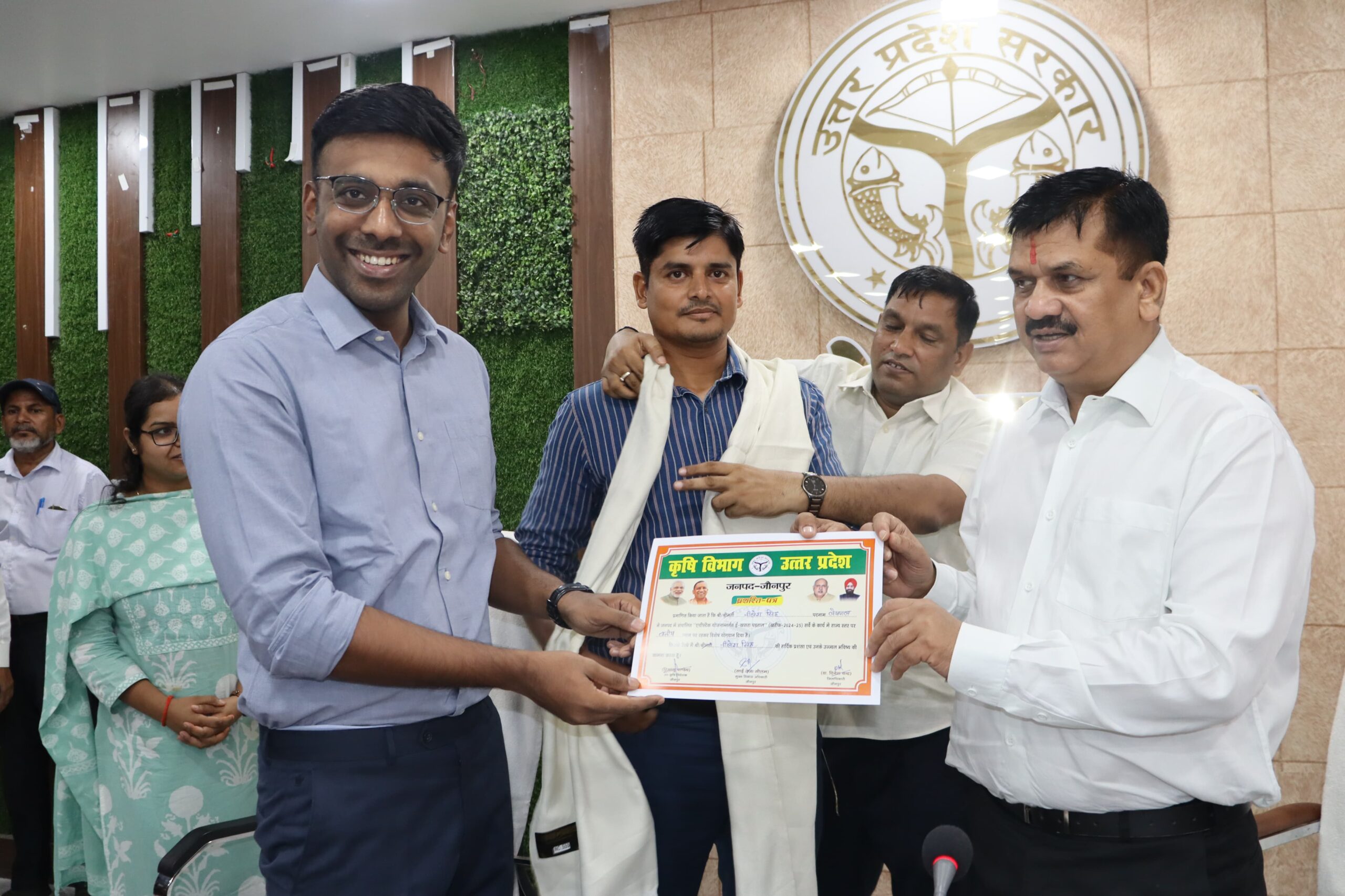 शासन द्वारा अतिमहत्वपूर्ण योजना एग्री स्टैक में 22 सितम्बर 2024 को प्रदेश में जारी टाप 20 की सूची जनपद जौनपुर के 10 लेखपालो को स्थान प्राप्त हुआ है, जिसमे से 5 लेखपाल तहसील सदर के कमांक 3 पर नीलेश सिंह, कमांक 6 पर पुष्पराज मौर्या, क्रमांक 8 पर दीपक उपाध्याय, क्रमांक 9 उमेश यादव, व क्रमांक 13 पर अंकित सरोहा को जिलाधिकारी व मुख्य विकास अधिकारी द्वारा अंग वस्त्र व प्रशस्ति-पत्र देकर सम्मानित किया गया