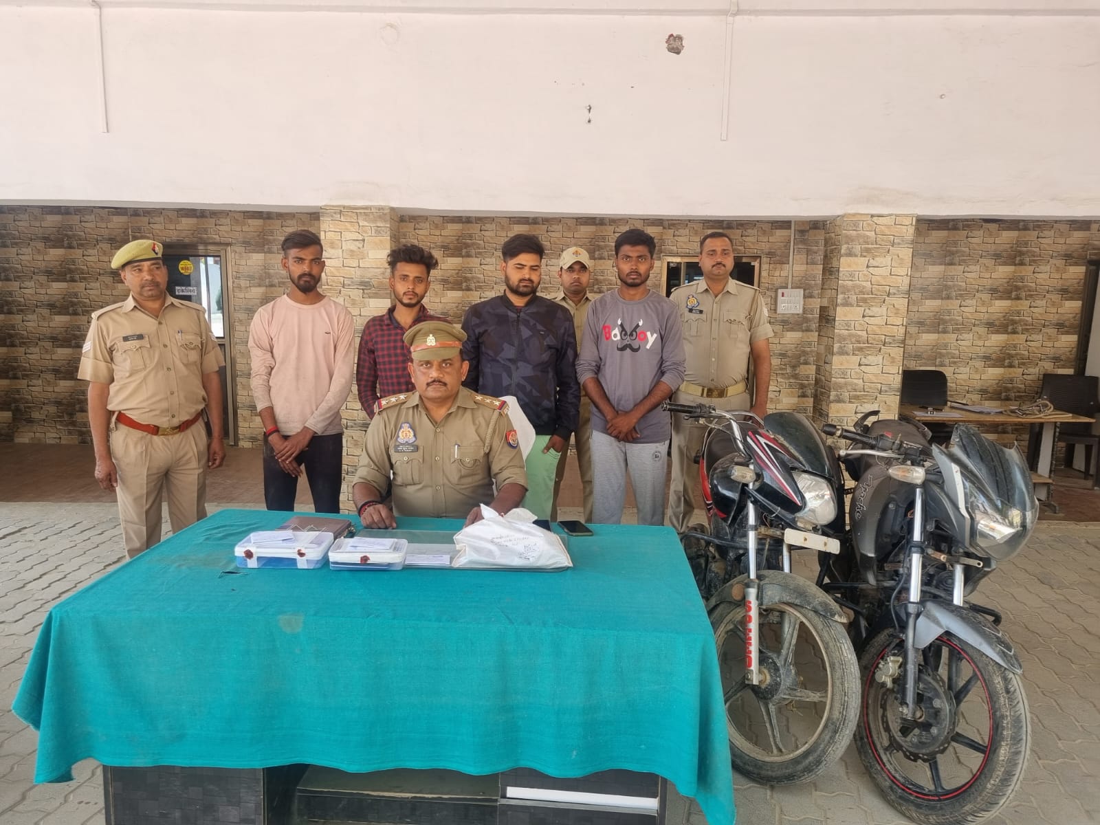 डा0 अजय पाल शर्मा, पुलिस अधीक्षक जनपद जौनपुर द्वारा अपराध एवं अपराधियों के विरूद्ध चलाये जा रहे अभियान के क्रम में अपर पुलिस अधीक्षक ग्रामीण शैलेन्द्र सिंह के दिशा निर्देशन एवं क्षेत्राधिकारी बदलापुर शुभम तोदी के कुशल पर्यवेक्षण में थाना बदलापुर पुलिस टीम द्वारा 04 शातिर लुटेरो को गिरफ्तार किया गया। थाना बदलापुर पुलिस टीम द्वारा देखभाल क्षेत्र, तलाश वांछित अभियुक्त, व अवैध वाहन/संदिग्ध व्यक्तियों की चेकिंग के दौरान मुखबिर खास द्वारा सूचना प्राप्त हुई कि कुछ शातिर लुटेरे जिन्होने बदलापुर क्षेत्र में कई छिनैती की घटना को अंजाम देते रहते है, आज फिर एक बड़ी घटना को अंजाम देने की फिराक में डकैती की योजना बना रहे है, यदि जल्दी किया जाय तो उनको पकड़ा जा सकता है। इस सूचना पर विश्वास कर के पुलिस टीम द्वारा आदर्श फिलिंग स्टेशन के बगल में बने सरायत्रिलोकी की तरफ जाने वाले रास्ते से 200 मीटर अंदर की तरफ स्थित अहाते में चार शातिर लुटेरे बदलापुर में स्थित सर्राफा की दुकान की लूट की योजना बनाते हुए लुटेरे अभियुक्तों 1-सूरज यादव पुत्र अमृत लाल यादव नि0ग्रा0 सरायभिखारी थाना आसपुर देवसरा प्रतापगढ 2-अंकित यादव पुत्र बाबूलाल यादव नि0 हरिकापूरा उर्फ हरीपुर थाना आसपुर देवसरा, प्रतापगढ 3-सौरभ तिवारी पुत्र विनोद तिवारी नि0 हरिकापूरा उर्फ हरीपुर थाना आसपुर देवसरा, प्रतापगढ 4- नवीन यादव पुत्र प्रेमचन्द्र यादव नि0ग्रा0 किलाई थाना आसपुर देवसरा प्रतापगढ को बिती रात्रि गिरफ्तार किया गया। गिरफ्तार अभियुक्तों के पास से डकैती करने के औजार, मोटरसायकिल, तमंचा आदि बरामद किया गया।