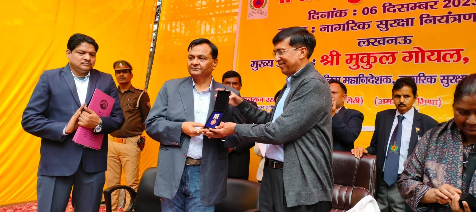 डी.जी.नागरिक सुरक्षा मुकुल गोयल ने राष्ट्रपति द्वारा प्रद्त पदक चीफ वार्डेन अमरनाथ मिश्र को पहनाकर प्रमाण पत्र देकर सम्मानित किया