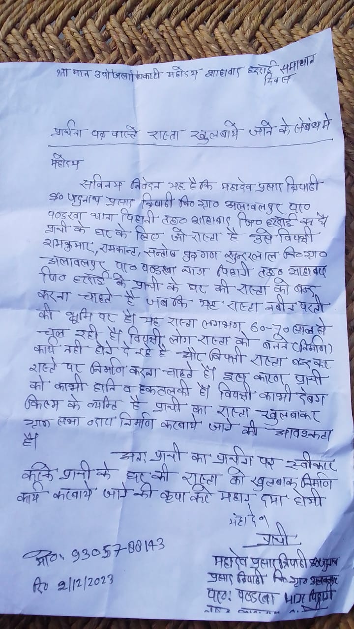 लखनऊ। उप जिलाधिकारी शाहाबाद को दिए गए प्रार्थना पत्र में महादेव प्रसाद त्रिपाठी पुत्र जदुनाथ प्रसाद त्रिपाठी ग्राम- अलावलपुर, परगना- पंडरवा थाना- पिहानी, तहसील -शाहाबाद ,जिला – हरदोई ने कहा कि घर आने जाने के लिए जो रास्ता है उसे विपक्षी रामकुमार ,रमाकांत, संतोष पुत्रगण सुंदरलाल ग्राम- अलावलपुर पोस्ट- रसूलपुर थाना- पिहानी ,तहसील-शाहाबाद जिला- हरदोई, का निवासी है प्रार्थी के घर की रास्ता बंद करना चाहते हैं जबकि यह रास्ता नवीन परती की भूमि पर है यह रास्ता लगभग 60 से 70 वर्ष से चल रही है विपक्षी लोग रास्ता को बनाने के लिए जो कार्य चल रहा है उसमें अवरोध उत्पन्न कर रहे हैं इस कारण प्रार्थी को बहुत आने-जाने में समस्या होती है और वह लोग निकलने नहीं देते हैं। विपक्षी दबंग किस्म के व्यक्ति हैं अतः प्रार्थी का रास्ता खुलवाकर ग्राम सभा द्वारा निर्माण कार्य कराए जाने की आवश्यकता है प्रार्थी जब भी उस रास्ते से आता जाता है तो विपक्षी लोग प्रार्थी के साथ गाली गलौज और मारपीट पर आमादा रहते हैं।