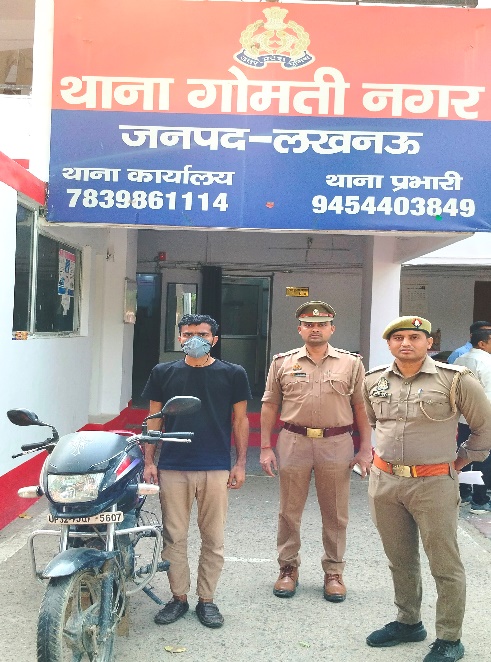 लखनऊ। थाना गोमती नगर पुलिस टीम द्वारा थाना स्थानीय पर पंजीकृत 344/2023 धारा 406/420/411 भा0द0०वि० से सम्बन्धित अभियुक्त मोहम्मद आरिफ पुत्र अजीज अहमद निवासी ग्राम महेवागंज सिंगारपुर थाना कोतवाली नगर जनपद लखीमपुर खीरी, हालपता ग्राम छतौनी थाना नगराम जनपद लखनऊ उम्र करीब 29 वर्ष को मुखबिर की सूचना पर शहीद पथ फ्लाई ओवर के नीचे से ग्वारी चौराहा मार्ग गोमतीनगर से दिनांक 08.5.2024 को 20:42 बजे गिरफ्तार किया गया एवं अभियुक्त के कब्जे से मुकदमा उपरोक्त से सम्बन्धित 01 अदद मोटरसाइकिल हीरो सुपर स्पलेण्डर गाडी नं0 UP32JQ5607 रंग ब्लैक बरामद की गयी।