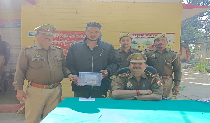 अजय पाल शर्मा, पुलिस अधीक्षक जौनपुर द्वारा जनपद में अपराध की रोकथाम व अपराधियों की गिरफ्तारी हेतु चलाएं जा रहे अभियान के क्रम में अपर पुलिस अधीक्षक ग्रामीण जौनपुर के निर्देशन व क्षेत्राधिकारी मड़ियाहूं के पर्वेक्षण में थाना नेवढ़िया पुलिस टीम द्वारा मुखबिर की सूचना पर लालाबाजार चौराहा बहदग्राम काजीहद से रोबिन सिंह उर्फ सौरभ सिंह पुत्र तारकेश्वरनाथ सिंह निवासी काजीहद थाना नेवढिया जनपद जौनपुर को गिरफ्तार किया गया। तलाशी से एक नाजायज तमंचा 315 बोर व एक जिन्दा कारतूस 315 बोर बरामद हुआ। जिसके आधार पर मु0अ0स0-15/23 धारा-3/25 आर्म्स एक्ट पंजीकृत नियमानुसार विधिक कार्यवाही की गयी।