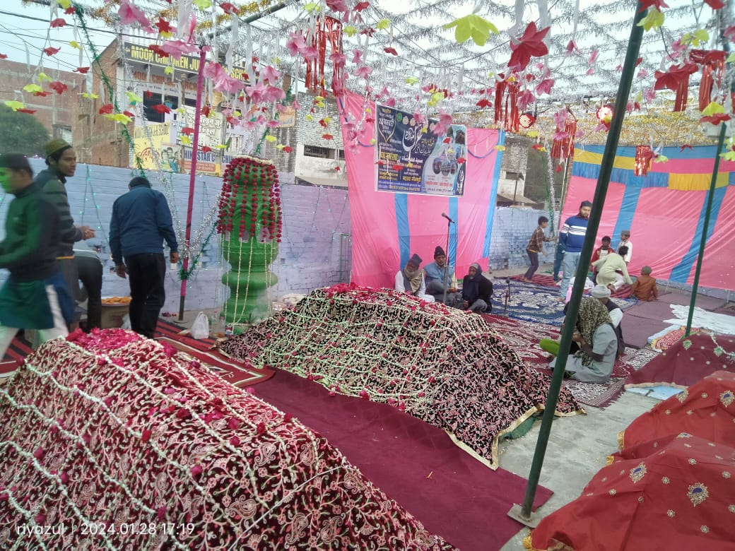 जौनपुर शहर के बागीचा उमर खा बड़ी मस्जिद के पूर्वी गेट के सामने आज 16 रजब 1445 हिजरी को सालाना कदीमी उर्स बहुत ही धूमधाम से संपन्न हुआ ,मास्टर मेराज अहमद खादिम ए आस्ताना ने बताया कि सुबह फजर की नमाज के बाद कुरान ख्वानी हुई उसके बाद नमाज जोहर में जश्ने ईद मिलादुन्नबी का एक प्रोग्राम हुआ जिसमे मौलाना ने इस्लाम और मुल्क में रहने वाले लोगो के साथ भाईचारा बनाने पर जोर दिया,असर की नमाज़ के बाद कुल शरीफ एवम चादरपोशी हुई,उर्स हजरत अल्लामा मौलाना अल्फाज मुफ्ती मोहिउद्दीन अहमद हसन जाफरी के सरपरस्ती में संपन्न हुआ,मोहम्मद अहमद रजा बरकती ने बुजुर्ग के बताए मार्ग पर चलने की सलाह दी ,संचालन मौलाना महशर जौनपुरी ने किया, इस मौके पर शायर ए इस्लाम हाफिज शमशुद्दीन और हसीन जौनपुरी ने अपनी शायरी के तथा कव्वाली के माध्यम से लोगों में शमा बांध दिया।उर्स में आस्थावान लोगों ने नज़र नियाज़ करवा कर देश में अमन और शांति की दुआ मांगी।