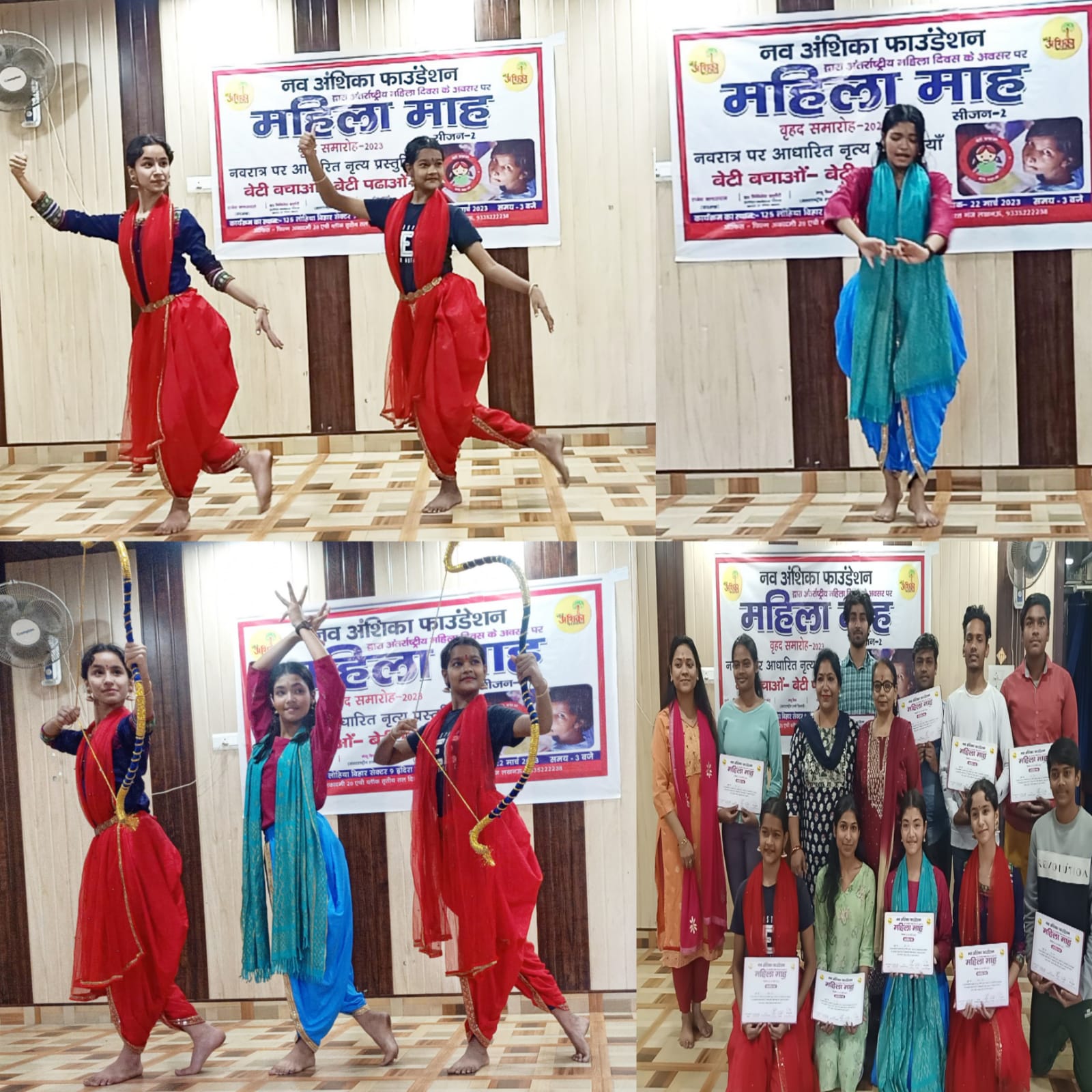 लखनऊ। नव अंशिका फाउंडेशन की ओर से नव अंशिका महिला महिला माह की इसकी चौथी कड़ी में नवरात्र पर आधारित बेटी बचाओ बेटी पढ़ाओ पर नृत्य प्रस्तुति बुधवार 22 मार्च को इंदिरा नगर के लोहिया विहार सेक्टर-9 में हुई। इसमें अंशिका त्यागी एवं साथी कलाकारो में इशिका त्रिपाठी वंशिका शर्मा, वर्षा सिंह, अंशिका शर्मा, आयुष प्रताप सिंह, आयुष चौहान, आयुष शर्मा जीतू राजपूत आदि द्वारा खूबसूरत संदेश बेटी बचाओ बेटी पढ़ाओ पर मृत्य प्रस्तुती के माध्यम से दिया गया