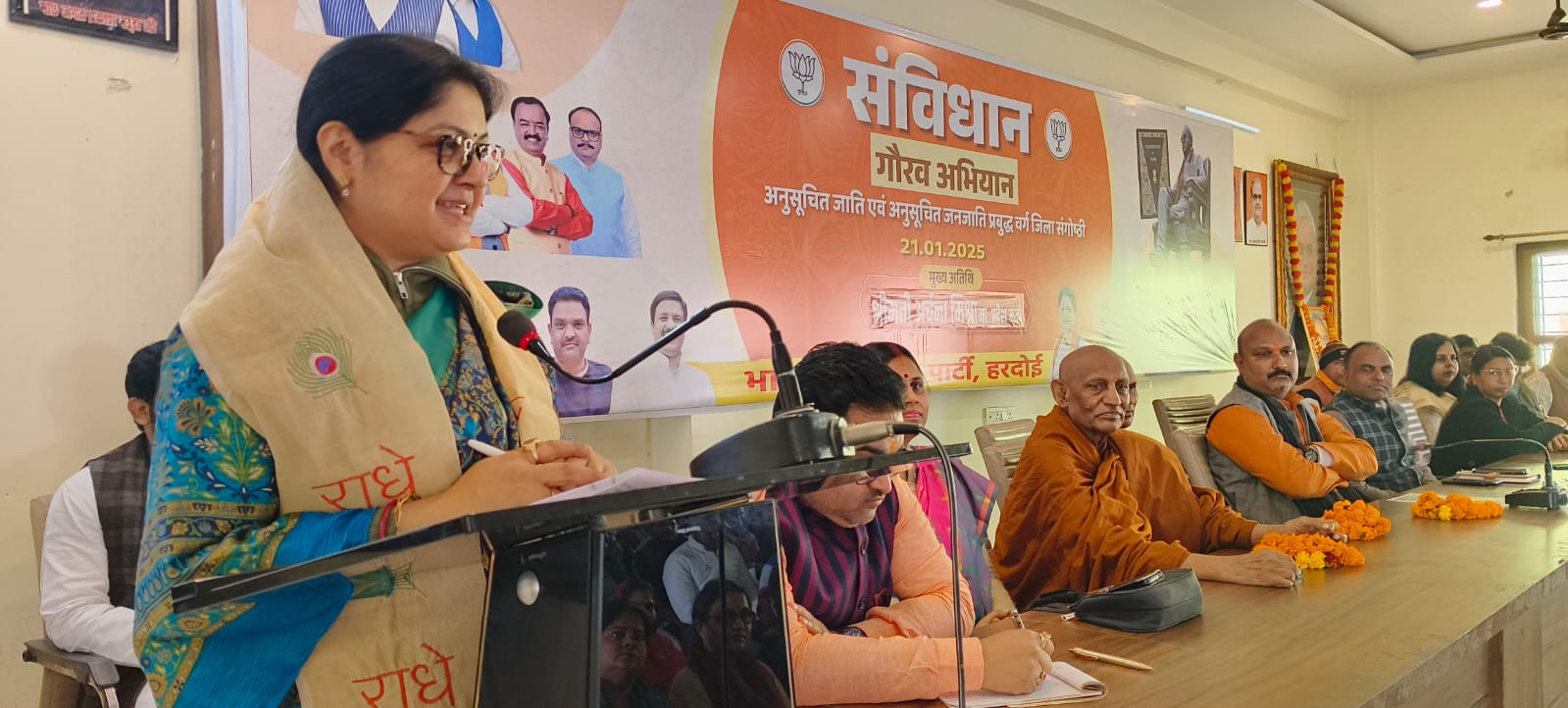 संविधान गौरव अभियान के अंतर्गत अनुसूचित जाति एवं अनुसूचित जनजाति प्रबुद्ध वर्ग जिला संगोष्ठी का आयोजन जिला अध्यक्ष अजीत सिंह बब्बन की अध्यक्षता में संपन्न हुआ। संगोष्ठी में मुख्य अतिथि प्रदेश मंत्री अर्चना मिश्रा ने कहा कि संविधान निर्माता भारत रत्न डॉक्टर भीमराव अंबेडकर के मूल्यों और सिद्धांतों का चीरहरण कांग्रेस शासनकाल मे हुआ।