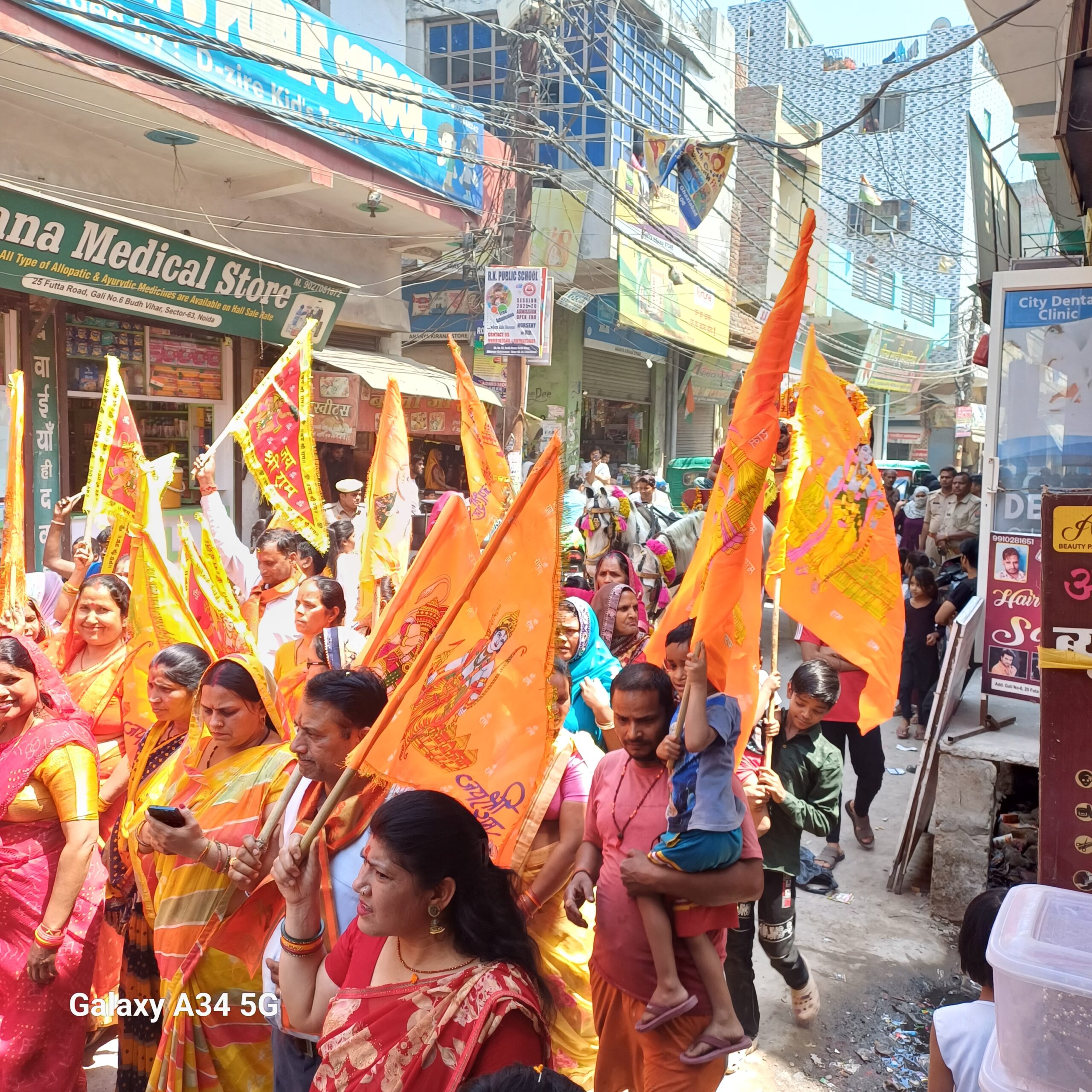 नोएडा: नोएडा सेक्टर 63 अंतर्गत बुद्ध विहार कॉलोनी के 25 फुटा रोड के हनुमान मंदिर से रामनवमी के शुभ अवसर पर शोभा यात्रा निकाली गई| जिसमें छोटे बच्चों से लेकर महिलाएं और पुरुषों ने बढ़ चढ़कर भाग लिया| पुलिस प्रशासन के तरफ से भी सुरक्षा के कड़े इंतजाम किए गए थे, आज चैत मास की नवरात्रि की नवमी के पावन अवसर पर जगह-जगह भंडारे का आयोजन किया गया, श्रद्धालुओं ने बड़े श्रद्धा और भाव के साथ प्रसाद का वितरण किया, लोगों ने अपने घरों में छोटी कन्याओं के पांव पखारे और उनके अंदर माता के स्वरूप को देखते हुए आदर् सम्मान सहित भोजन काराए |