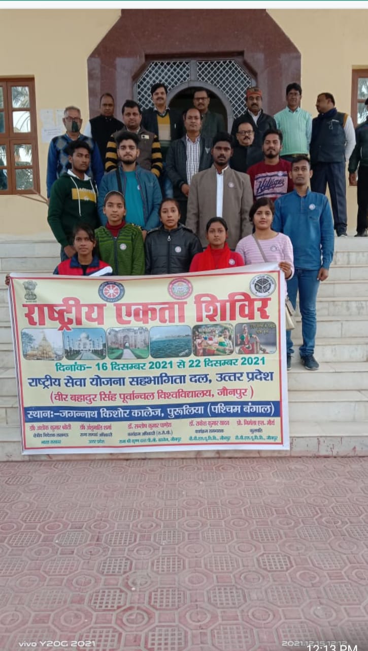 वीर बहादुर सिंह पूर्वांचल विश्वविद्यालय के राष्ट्रीय सेवा योजना के 10 स्वयंसेवकों का दल पुरुलिया,पश्चिम बंगाल के लिए आज रवाना हुआ। कुलसचिव महेंद्र कुमार एवं कार्यक्रम समन्वयक डॉ राकेश कुमार यादव ने विश्वविद्यालय परिसर से हरी झंडी दिखाकर इस दल को रवाना किया।इस दल का नेतृत्व डॉ संतोष कुमार पांडेय,कार्यक्रम अधिकारी आर.एस.के.डी.पी.जी कॉलेज जौनपुर कर रहे हैं।यह दल दिनांक 16दिसंबर से 22 दिसंबर 2021 तक जगन्नाथ कॉलेज पुरुलिया, पश्चिम बंगाल में आयोजित सात दिवसीय राष्ट्रीय एकीकरण शिविर पूरे प्रदेश का प्रतिनिधित्व करेगा। 05 स्वयंसेवक तथा 05 स्वयंसेविकाओं सहित दस सदस्यीय यह दल उत्तर प्रदेश की सभ्यता एवं संस्कृति का प्रदर्शन इस शिविर में करेगा।कुलपति प्रो. निर्मला एस.मौर्य ने स्वयंसेवकों को इस शिविर में अच्छे प्रदर्शन के लिए अपनी शुभकामनाएं दीं हैं।।कुलसचिव महेंद्र कुमार ने स्वयंसेवकों से कहा कि यह हमारे विश्वविद्यालय के लिए गौरव की बात है कि सभी स्वयंसेवक हमारे ही विश्वविद्यालय से चुने गए हैं जो पूरे प्रदेश का प्रतिनिधित्व करेंगे।
