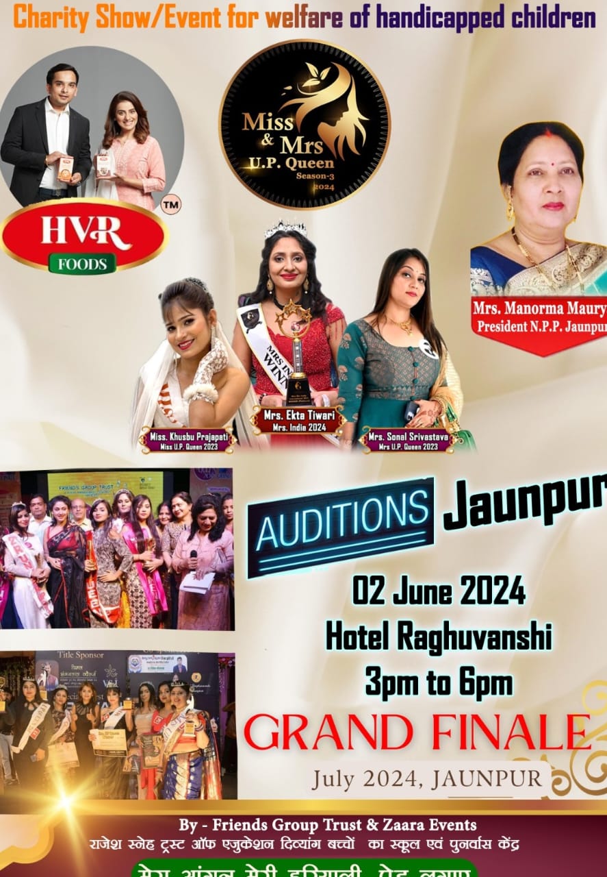 द्वारा आयोजित मिस एंड मिसेज यू पी क्वीन 3 2024 का ग्रैंड फिनाले से पूर्व जौनपुर ऑडिशन रविवार दिन में 3:00 से 6:00 होटल रघुवंशी में रखा गया है जिसमें प्रतिभाशाली बच्चियों एवं महिलाएं ब्रेन विद ब्यूटी का ऑडिशन देंगे सिलेक्ट होने वालों को ग्रैंड फिनाले में प्रतिभाग कराया जाएगा ग्रैंड फिनाले में मिस एवं मिसेज यूपी का टाइटल एवं 51000 नगद पुरस्कार एक वीडियो एल्बम दिया जाएगा