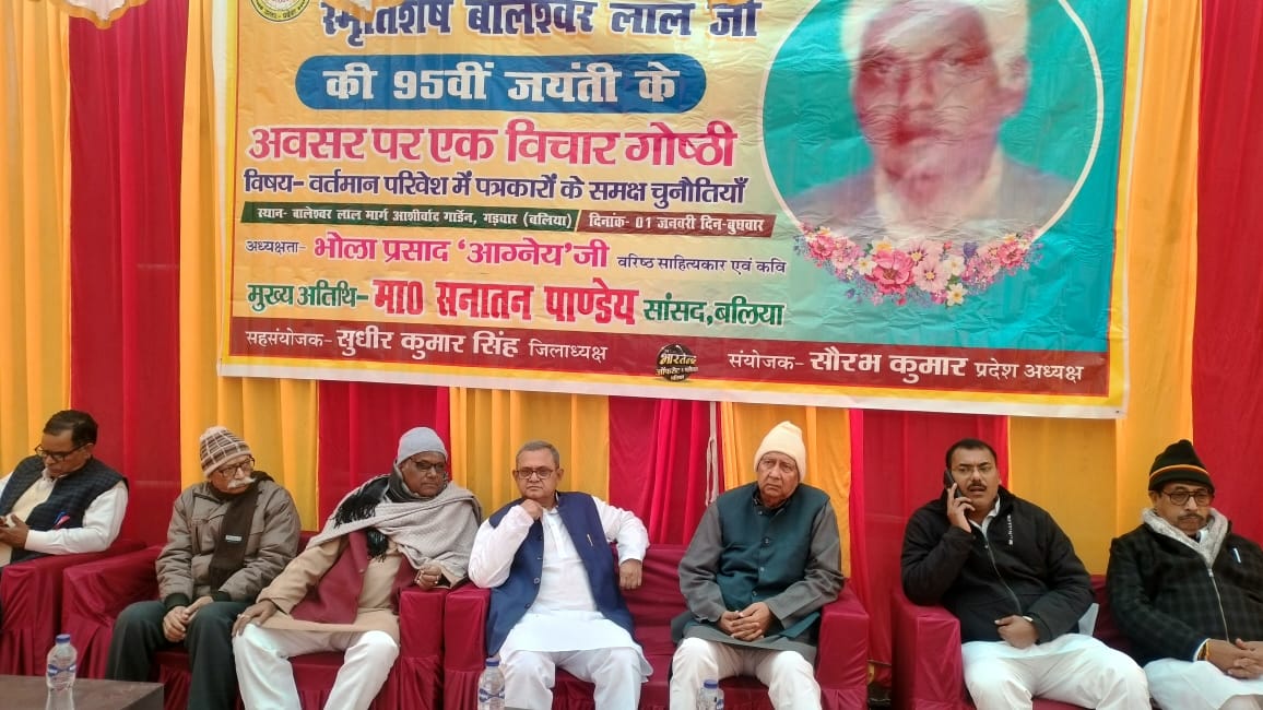 गड़वार(बलिया) : ग्रामीण पत्रकार एसोसिएशन उत्तर प्रदेश के संस्थापक अध्यक्ष बालेश्वर लाल जी की 95 वीं जयंती पर बुधवार को आयोजित गोष्ठी को संबोधित करते हुए मुख्य अतिथि सांसद सनातन पांडेय ने कहा कि बालेश्वर लाल आजीवन ग्रामीण पत्रकारों के हक-हकूक लिए संघर्ष करते रहे।उनके आदर्शों व नीतियों को आत्मसात कर उनके अधूरे कार्यों को पूरा करना ही उनके प्रति सच्ची श्रद्धांजलि होगी। गोष्ठी को पूर्व मंत्री राजधारी सिंह,पूर्व विधायक सुधीर राय, कैप्टन वीरेंद्र सिंह,ओम प्रकाश द्विवेदी,कृष्ण मुरारी पांडेय,गुप्तेश्वर पाठक,जय प्रकाश गोविन्द राव,रणजीत राय,नागेंद्र शर्मा आदि ने संबोधित किया।संगठन के प्रदेश अध्यक्ष सौरभ कुमार ने संगठन की नीतियों व कार्यों पर विस्तार से विचार व्यक्त किया।इस मौके पर अतिथियों व पत्रकारों को अंग वस्त्र व स्मृति चिन्ह देकर सम्मानित किया गया।इसके पूर्व बालेश्वर लाल की प्रतिमा पर माल्यार्पण व दीप प्रज्वलित कर गोष्ठी का शुभारंभ मुख्य अतिथि ने किया।सेनानी राम विचार पांडेय,सुभाष जी,बसंत पांडेय,प्रशांत,पीयूष,प्रखर,लल्लन गुप्ता आदि मौजूद रहे। अध्यक्षता जिलाध्यक्ष सुधीर सिंह व संचालन छोटे लाल ने किया।
