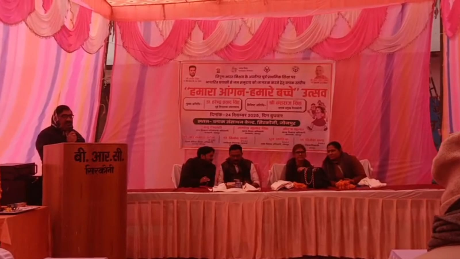 जौनपुर : शासन के निर्देशानुसार बी आर सी सिरकोनी के प्रांगण में बेसिक शिक्षा परिषद के बच्चों तथा आंगनबाड़ी/बाल वाटिका के कार्यकर्तियों तथा बच्चों के उन्मुखीकरण हेतु सिरकोनी ब्लाक के खण्ड शिक्षा अधिकारी श्री अमरेश कुमार सिंह की अध्यक्षता में दिनांक 24-12-2025 को हमारा आंगन- हमारे बच्चे कार्यक्रम का आयोजन किया गया। कार्यक्रम में मुख्य अतिथि के रूप में उपस्थित जफराबाद विधानसभा के यशस्वी व लोकप्रिय पूर्व विधायक माननीय डा. हरेन्द्र प्रताप सिंह जी के कर कमलों से मां सरस्वती जी के चित्र पर माल्यार्पण करके और उनके सम्मुख धूप-दीप प्रज्वलित करके कार्यक्रम का शुभारंभ किया गया। खण्ड शिक्षा अधिकारी सिरकोनी द्वारा कार्यक्रम में उपस्थित मुख्य अतिथि महोदय सहित बाल विकास परियोजना अधिकारी अंशू त्रिपाठी , ए डी ओ पंचायत रत्नेश कुमार तथा आंगनवाड़ी सुपरवाइजर इन्द्रा पाल जी का माल्यार्पण करके तथा अंगवस्त्रम, डायरी व पेन प्रदान करके स्वागत किया गया। पूर्व माध्यमिक विद्यालय बाकराबाद तथा इंग्लिश मीडियम प्राथमिक विद्यालय चकताली की बच्चियों द्वारा सरस्वती वंदना तथा स्वागत गीत प्रस्तुत किया गया। कार्यक्रम में मुख्य अतिथि के रूप में बोलते हुए माननीय पूर्व विधायक डा.हरेन्द्र प्रताप सिंह जी द्वारा जाति-धर्म की भावना से ऊपर उठकर सन् 2047 तक विकसित उत्तर प्रदेश के साथ साथ विकसित भारत की परिकल्पना को साकार करने हेतु सबका आह्वान किया गया। उन्होंने आगे कहा कि शिक्षा के अधिकार से न तो कभी किसी को वंचित किया गया था और न ही किया जाना चाहिए। प्राचीन काल से ही भारतीय समाज के सभी वर्गों के बच्चे एक ही गुरुकुल अथवा विद्यालय में पढ़ते चले आ रहे हैं। पढ़ने की इच्छा और जिजीविषा रखने वाले बच्चों के साथ शिक्षकों द्वारा जाति-धर्म के नाम पर कभी भी पक्षपात नहीं किया गया। हमारे पूरे इतिहास में ऐसे अनेक विद्वानों के नाम आते हैं जो समाज के पिछड़े और गरीब वर्ग से सम्बद्ध होते हुए भी उच्च शिक्षा प्राप्त करके अपने माता-पिता, परिवार,समाज और देश का नाम रोशन किये हैं, जिसमें उनके गुरुजन का विशेष योगदान रहा है । वर्तमान राजनीतिक दलों द्वारा वोट की राजनीति करते हुए शिक्षा के आधार पर समाज को जाति-धर्म में बांटना भारत के भविष्य के लिए अच्छा नहीं होगा।