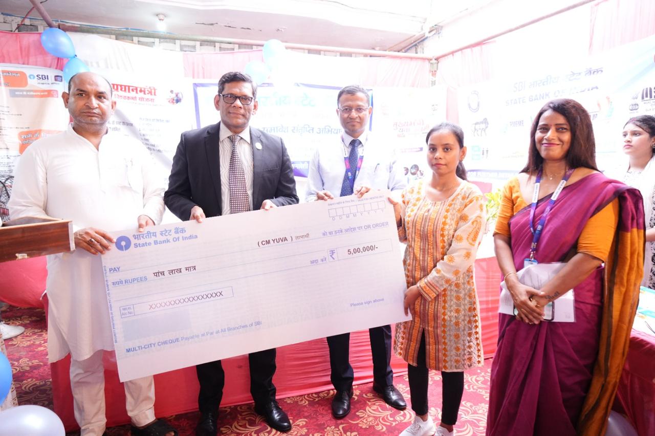 भारतीय स्टेट बैंक के ग्राम पंचायत संतृप्ति शिविर में जनसुरक्षा बीमा योजनाओ एवं सीएम युवा लाभार्थियों को बाटें चेक