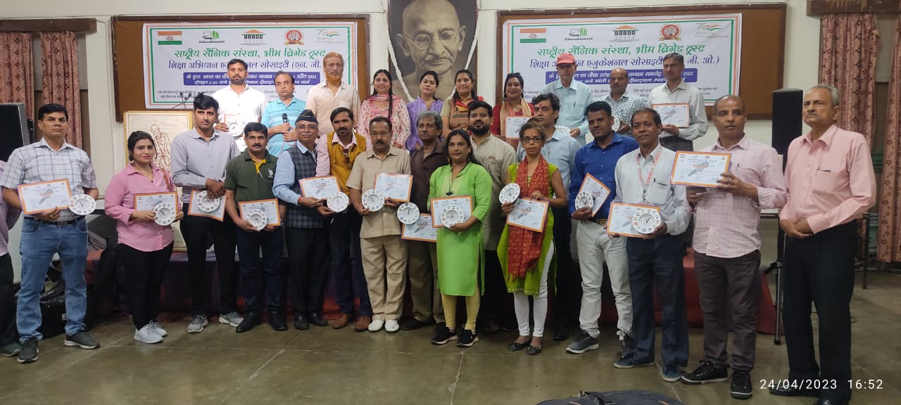 नई दिल्ली:राष्ट्रीय सैनिक संस्था भीम ब्रिगेड ट्रस्ट और शिक्षा अभियान एनजीओ द्वारा शिक्षा अभियान चलाया जा रहा है, जिसका उद्देश्य हर बच्चा हो शिक्षित, वही भारत का चौथा स्तभ मिडिया को भी सम्बोधित कर सम्मानित पत्रकारों को गांधी शांति प्रतिष्ठान नई दिल्ली में संस्था द्वारा बनवाई 14 गरम दल क्रांतिकारी शहीदों की तस्वीर वाली घड़ी और सर्टिफिकेट द्वारा सम्मानित किया। सर्वप्रथम गांधी शांति प्रतिष्ठान के सचिव तेजपाल को भी ऐतिहासिक घड़ी द्वारा सम्मानित किया गया उसके बाद आवाज की जादूगरनी साक्षी कुमारी,प्रसिद्ध सिंगर सुरेंद्र पुष्करणा , बृजेश , सुभाष राय , संदीप , उमा को भी बेहतरीन राष्ट्रभक्ति के गीत सुनाए जाने पर सम्मानित किया वही, पत्रकारों में सुधीर कुमार , कुलवंत कौर , नरेंद्र ,सीनियर पत्रकार बंसी लाल ,दीपक आनंद , एके अवस्थी,कमल नेगी , राजेश , किशन सिंह , शंकर धवन , रंजीत गुप्ता ,डॉ नदीम अहमद , बृजेश कुमार ,राहुल , राजेश खन्ना , को ऐतिहासिक घड़ी द्वारा सम्मानित किया गया, संदीप गुड़ियाल , विवेकद्वारा शिक्षा की एक नई ऐप को भी निर्धारित किया गया उपस्थित श्रीमान जुगल किशोर ,रीमा , निशा शर्मा , ओम जी, महेश, अर्चना झा , भूषण जैन , राजबाला , डॉ एकता सिंह व सैकड़ों राष्ट्रभक्त उपस्थित थे। जनता से जुड़ी कई समस्याओं पर् विचार विमर्श किया गया, उसमे शिक्षा का कॉमन सिलेबस होना चाहिए राजमार्गों पर टोल की धोखाधड़ी, चिकित्सा के नाम पर हो रहा गोरखधंधा खाद्य, पदार्थों में मिलावट खोरी, बेरोजगारी और महंगाई को लेकर भी चिंता व्यक्त की गई।