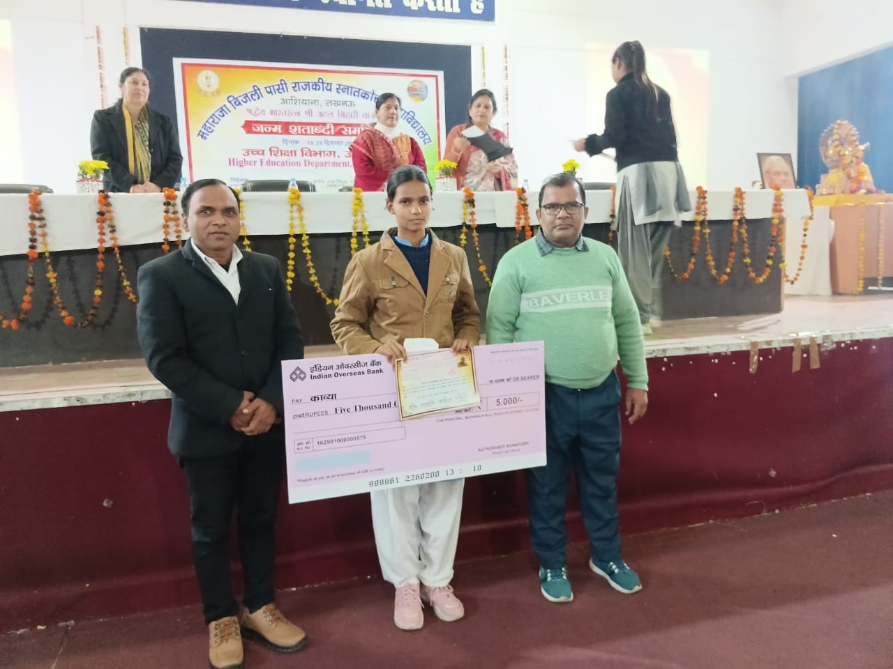 इस उपलब्धि के उपलक्ष्य में दिनांक 25 दिसंबर 2025 को आयोजित सम्मान समारोह में उच्च शिक्षा निदेशक, लखनऊ प्रोफेसर अमित भारद्वाज, क्षेत्रीय उच्च शिक्षा अधिकारी श्री अश्विनी कुमार मिश्र, जिला नोडल अधिकारी (उच्च शिक्षा) डॉ. सुमन गुप्ता, सह निरीक्षक, आंग्ल भारतीय विद्यालय, लखनऊ श्रीमती मनीषा द्विवेदी एवं क्षेत्रीय पार्षद श्रीमती रिचा मिश्रा के करकमलों द्वारा छात्रा को ₹5000/- की पुरस्कार राशि एवं प्रमाण-पत्र प्रदान कर सम्मानित किया गया।