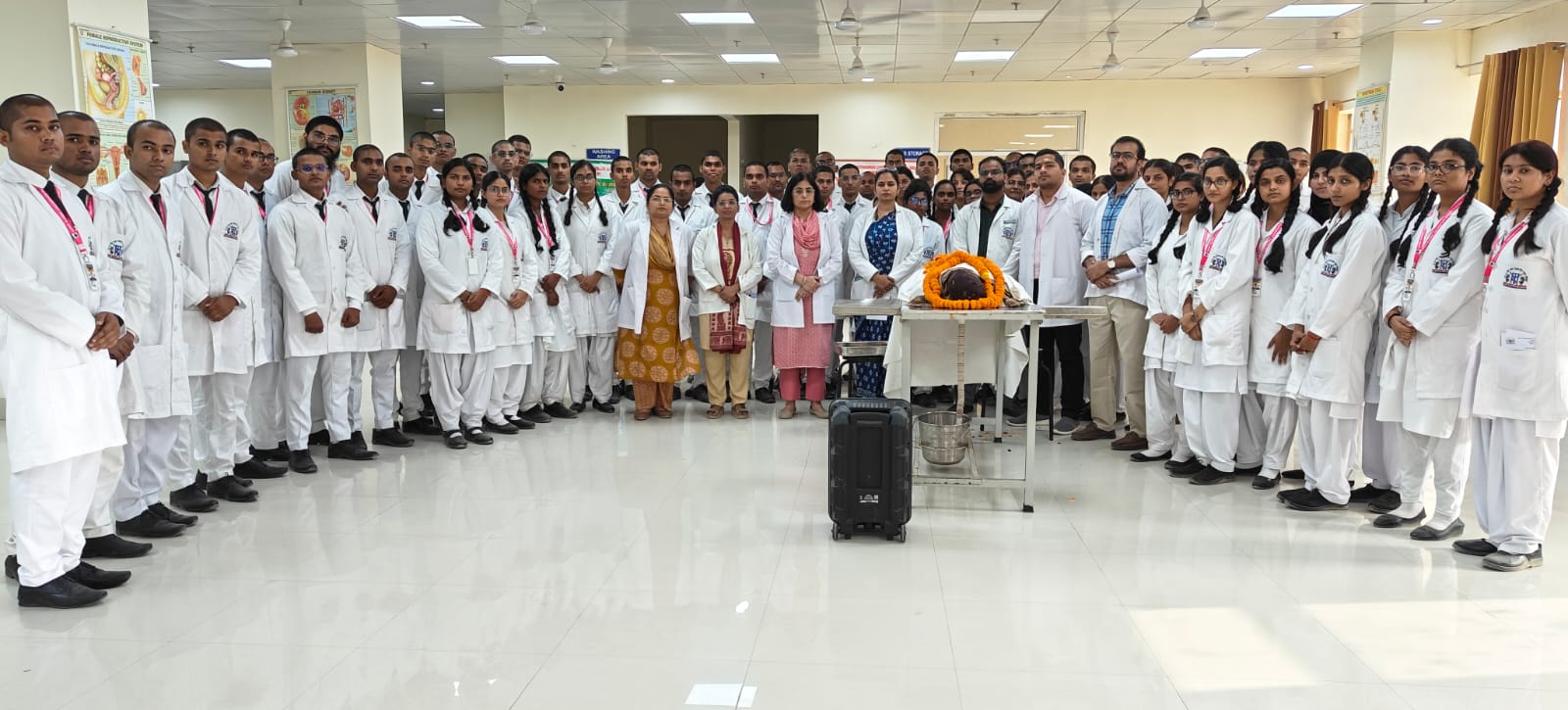सहायक आचार्य, डा० अर्चना चौधरी एवं डा० प्रियंका सिंह ने संयुक्त रूप से संबोधन में कहा कि कैडवर प्रत्येक चिकित्सा विद्यार्थी के लिए “मौन गुरू” के समान है, जो उन्हें मानव शरीर की गहराइयों को समझने का अवसर प्रदान करता है। उन्होंने बताया कि शरीर दान करने वाले व्यक्ति का यह महान योगदान मानवता की सर्वोच्च मिसाल है। विद्यार्थियों को चाहिए कि वे अध्ययन के दौरान इन कैडावर्स के प्रति सम्मान, संवेदना और कृतज्ञता का भाव बनाए रखें।