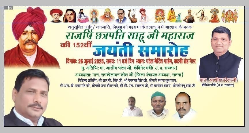 *मैहर, 21 जुलाई 2025:* मध्य प्रदेश के मैहर जिले में ओबीसी, एससी/एसटी महासभा के तत्वाधान में आरक्षण के जनक, समाज सुधारक राजर्षि छत्रपति साहू जी महाराज की 152वीं जयंती का भव्य आयोजन होने जा रहा है। यह समारोह *26 जुलाई 2025, शनिवार को सुबह 11 बजे पटेल मैरिज गार्डन, कटनी रोड, मैहर में आयोजित किया जाएगा।* इस समारोह में मुख्य अतिथि के रूप में उत्तर प्रदेश सरकार के कैबिनेट मंत्री और अपना दल (एस) के राष्ट्रीय उपाध्यक्ष आशीष पटेल उपस्थित रहेंगे। समारोह की अध्यक्षता सतना जिला पंचायत अध्यक्ष रामखेलावन कोल करेंगे, वहीं आयोजकों में देवदत्त सोनी और वीरेंद्र सिंह पटेल भी मुख्य भूमिका में रहेंगे। विशिष्ट अतिथियों में अपना दल (एस) के राष्ट्रीय महासचिव और मध्य प्रदेश प्रभारी आर.बी. सिंह पटेल, देवराज सिंह, संध्या कुशवाहा, आर.डी. प्रजापति, उषा चौधरी, सी.एल. वंशकार, दामोदर यादव और रेनू शाह शामिल होंगे। समारोह को लेकर पार्टी की दृष्टि से राजनीतिक रणनीतिकार डॉ अतुल मलिकराम ने भी उत्साह व्यक्त किया है।
