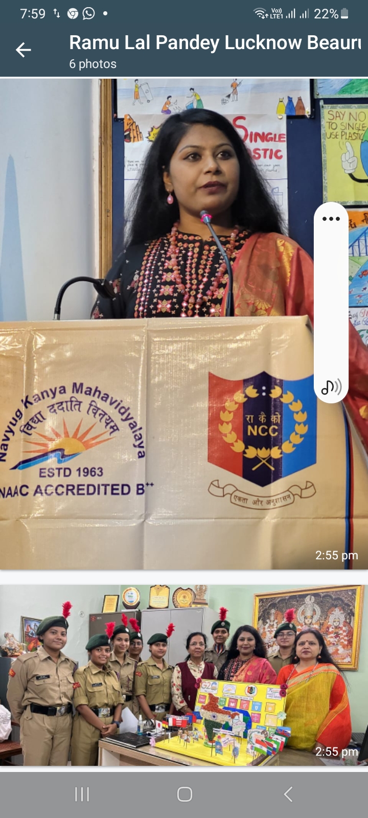 लखनऊ। नवयुग कन्या महाविद्यालय, राजेंद्र नगर लखनऊ की 19 उत्तर प्रदेश गर्ल्स बटालियन एनसीसी विंग द्वारा प्राचार्या प्रोफेसर मंजुला उपाध्याय की अध्यक्षता एवं एनसीसी अधिकारी मेजर (डॉ.) मनमीत कौर सोढ़ी के नेतृत्व में 8 तथा 9 सितंबर 2023 को दो दिवसीय *मेगा पुनीत सागर अभियान* के अंतर्गत *प्लास्टिक का पर्यावरण पर प्रभाव* विषय पर निबंध, संभाषण, प्रश्नोत्तरी प्रतियोगिताओं तथा पोस्टर व स्लोगन के माध्यम से जागरुकता कार्यक्रम का आयोजन किया गया I इस दो दिवसीय अभियान का समापन आज दिनांक 9 सितंबर को पुरस्कार वितरण समारोह के साथ हुआ I