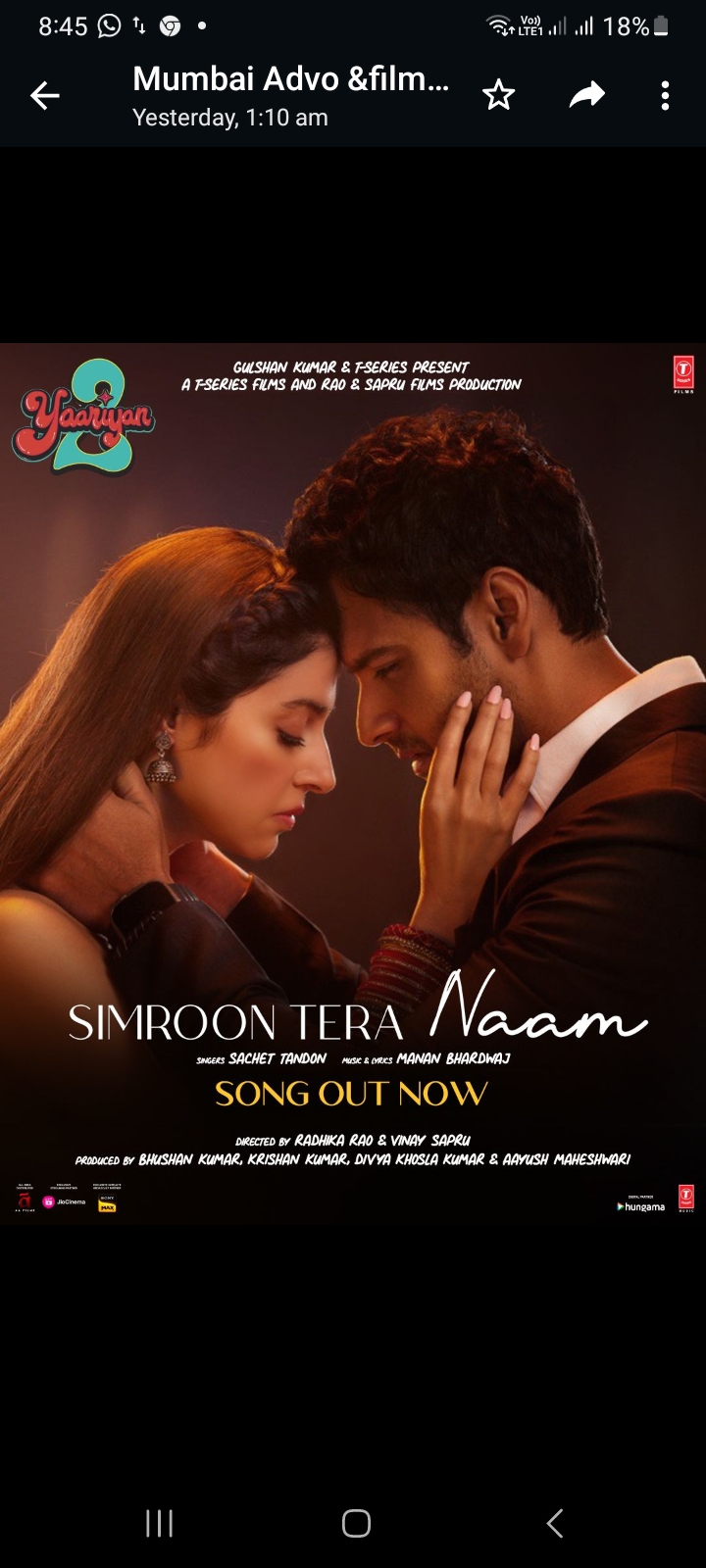 टी-सीरीज़ फिल्म्स और राव और सप्रू फिल्म्स प्रोडक्शन की फिल्म ‘यारियां 2’ का गाना ‘सिमरूं तेरा नाम…’ रिलीज़ कर दिया गया है। इस गाने में दिव्या खोसला कुमार और यश दासगुप्ता के बीच की केमिस्ट्री कमाल की है, यह गाना निश्चितरूप से दर्शकों को भावुक कर देगा। सचेत टंडन द्वारा खूबसूरती से गाया गया यह गाना मनन भारद्वाज द्वारा लिखा और कंपोज किया गया हैं। प्यार में वल्नरबिलिटी और ऑकवर्डनेस को हाइलाइट करता है। राधिका राव और विनय सप्रू द्वारा संयुक्त रूप से निर्देशित ‘यारियां 2’ में दिव्या खोसला कुमार, यश दास गुप्ता, मिजान जाफरी, अनस्वर राजन, वरीना हुसैन, प्रिया वारिर और पर्ल वी पुरी मुख्य भूमिका में हैं। भूषण कुमार, कृष्ण कुमार, दिव्या खोसला कुमार और आयुष माहेश्वरी द्वारा निर्मित यह फिल्म 20 अक्टूबर को सिनेमाघरों में रिलीज होगी।