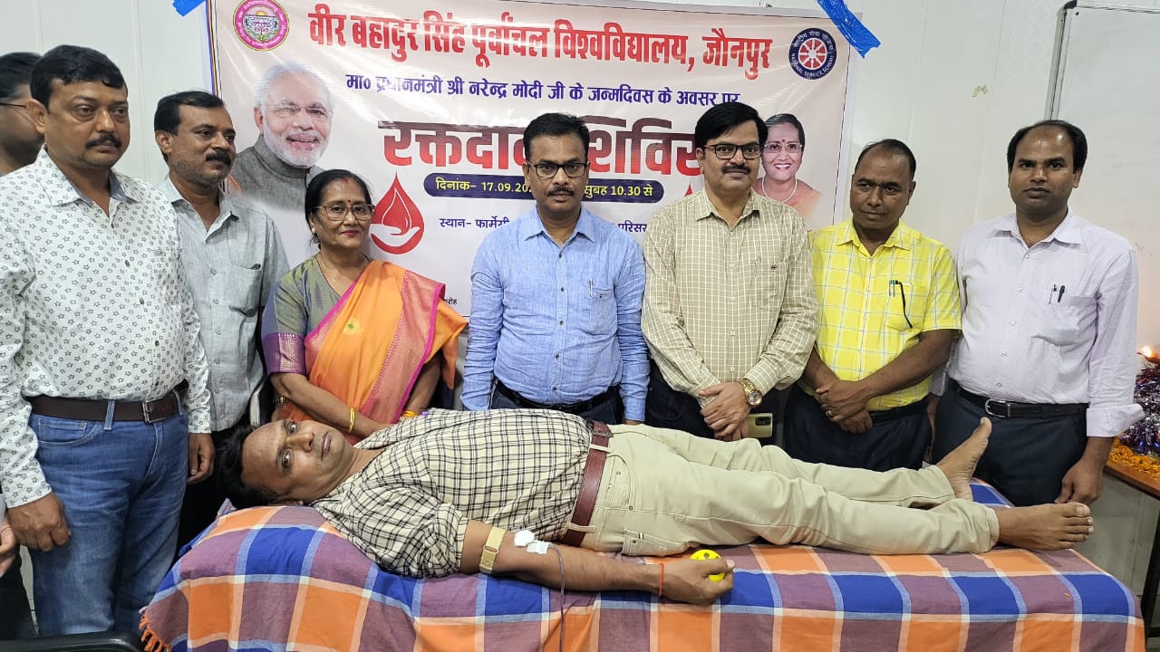 जौनपुर। वीर बहादुर सिंह पूर्वांचल विश्वविद्यालय के फार्मेसी संस्थान में प्रधानमंत्री श्री नरेन्द्र मोदी के 72 वें जन्मदिन के उपलक्ष्य में 17 सितम्बर से 2 अक्टूबर 2022 तक आयोजित सेवा पखवाड़ा के अन्तर्गत आज रक्तदान शिविर का आयोजन राष्ट्रीय सेवा योजना एवं आईएमए, जौनपुर के संयुक्त तत्वावधान में हुआ,जिसका उदघाट्न कुलपति प्रो. निर्मला एस. मौर्य ने किया।अपने उद्बोधन में कुलपति ने कहा कि रक्तदान मानवता का सबसे बड़ा दान है।रक्तदान करके हम किसी की जान बचा सकते हैं।उन्होंने समस्त रक्तदाताओं को प्रमाणपत्र वितरित करते हुए शुभकामनाएं दी।कुलसचिव महेंद्र कुमार ने कहा कि आजादी के समय नेताजी सुभाष चंद्र बोस ने नारा दिया था कि तुम मुझे खून दो, मैं तुम्हें आजादी दूंगा।आज यह नारा होना चाहिए कि तुम मुझे खून दो मैं तुम्हें मानवता दूंगा। डिप्टी सीएमओ डॉ एस.के.जायसवाल ने भी अपने विचार व्यक्त किये।डॉ सलिल यादव ने रक्तदान के महत्व के बारे में बताया।डीएसडब्लू प्रो. अजय द्विवेदी ने विश्वविद्यालय की इस पहल का स्वागत किया।समन्वयक डॉ. राकेश कुमार यादव ने कार्यक्रम की रूपरेखा का वर्णन किया। संचालन प्रो. मानस पाण्डेय ने और धन्यवाद ज्ञापन डॉ आलोक गुप्ता ने दिया।