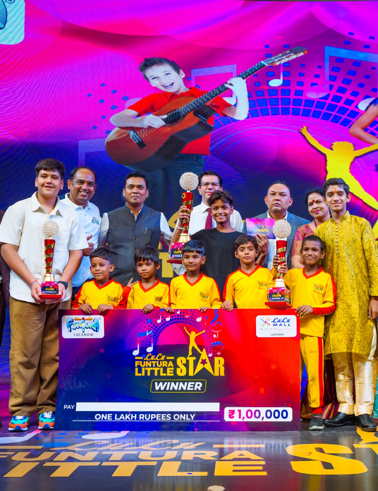 *लखनऊ*,, उत्तर प्रदेश के सबसे बड़े इनडोर पारिवारिक मनोरंजन गेम ज़ोन लुलु फंटुरा ने “फंटुरा लिटिल स्टार” का फाइनल आयोजित किया गया । इस आयोजन में 5-15 वर्ष की आयु के बच्चों की 21 दिनों की कड़ी मेहनत लगी, क्योंकि यह आयोजन तीन राउंड में विभाजित था। पहला राउंड प्रतिभा दिखाने के लिए था और हमें 1200 पंजीकरण प्राप्त हुए, जिनमें से 800 से अधिक बच्चे शहर और आसपास के जिलों के विभिन्न स्कूलों से आए थे। हम 50 बच्चों को अपने दूसरे राउंड में ले गए, जहां प्रतिभा का स्तर दोगुना था। हमारे जज पैनल की लंबी चर्चा के बाद, हम सर्वश्रेष्ठ 11 को अपने तीसरे और अंतिम राउंड में ले गए। हमारे जज डॉ. पूनम, सुश्री ईशा रतन, सुश्री मिशा रतन और श्री सैयद शमशुर रहमान ने कहा, “हमारे लिए बच्चों का चयन करना आसान नहीं था, क्योंकि वे उत्कृष्ट और उत्साह से भरे हुए थे। उन्होंने श्री बिजू सुगाथन (क्षेत्रीय प्रबंधक- लुलु मॉल, लखनऊ), श्री सेबतेन हुसैन (जनसंपर्क प्रबंधक- लुलु मॉल, लखनऊ) और श्री वसीम अहमद खान (प्रबंधक- फंटुरा, लुलु मॉल, लखनऊ) की उपस्थिति में विजेता को पुरस्कृत किया।