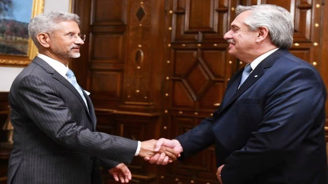 अर्जेंटीना के राष्ट्रपति फर्नांडीज से मुलाकात के बाद डॉक्टर जयशंकर ने कहा कि मुझे रिसीव करने के लिए राष्ट्रपति को धन्यवाद। जयशंकर ने कहा कि अर्जेंटीना के राष्ट्रपति ने व्यापार स्तरों को अधिक टिकाऊ और महत्वाकांक्षी बनाने सहित द्विपक्षीय सहयोग को मजबूत करने पर चर्चा की। उन्होंने ऊर्जा और खाद्य सुरक्षा पर भी विचारों का आदान-प्रदान किया। उन्होंने फार्मास्यूटिकल्स सहित सस्ती स्वास्थ्य सेवा के महत्व को रेखांकित किया। दोनों नेताओं ने रक्षा सहयोग के साथ-साथ परमाणु ऊर्जा की संभावनाओं पर भी विचारों का आदान-प्रदान किया। यह जयशंकर की दक्षिण अमेरिका की पहली आधिकारिक यात्रा है। वह पहले ही पराग्वे और ब्राजील का दौरा कर चुके हैं।
