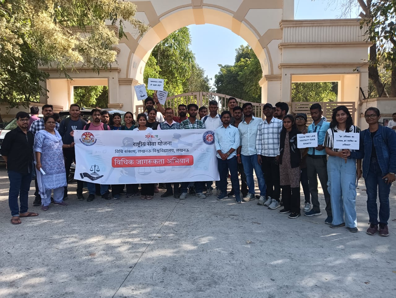 लखनऊ। विधि संकाय, लखनऊ विश्वविद्यालय द्वितीय परिसर की राष्ट्रीय सेवा योजना की दोनों इकाइयों के कार्यक्रम अधिकारियों डॉक्टर शशि प्रभा जोशी एवं डॉक्टर चंद्र शेखर राय द्वारा तृतीय एकदिवसीय शिविर के अंतर्गत विधिक जागरूकता अभियान का सफलतापूर्वक आयोजन किया गया। जो अपरान्ह 2:00 बजे द्वितीय परिसर के गेट नंबर 2 से मुलायम तिराहा होते हुए वापस गेट नंबर 2 पर आकर संपन्न हुआ इस जागरूकता अभियान में स्वयं सेवकों द्वारा विधिक जागरूकता के अंतर्गत लोगों को विधिक अधिकारों एवं कर्तव्यों के बारे में विस्तृत जानकारी लोगों में दी गई।