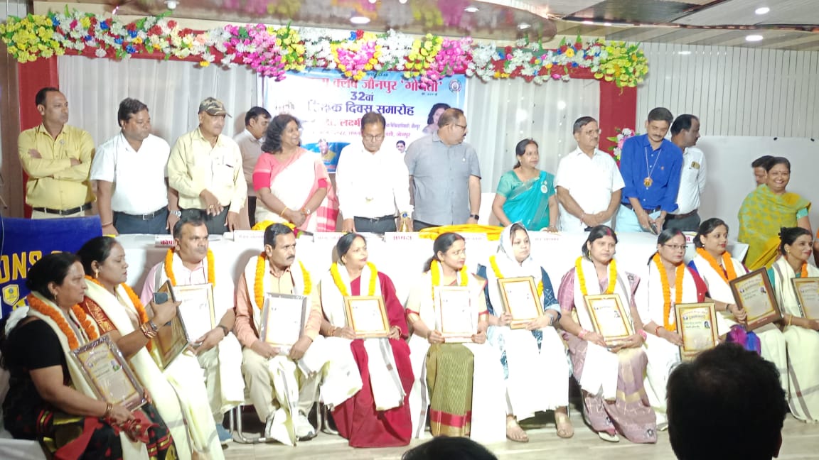 जौनपुर: लायंस क्लब गोमती जौनपुर द्वारा पूर्व राष्ट्रपति डॉक्टर सर्वपल्ली राधाकृष्णन के जन्मदिवस के अवसर पर सोमवार देर शाम एक होटल के सभागार में 32वा शिक्षक दिवस समारोह बड़े हर्षोल्लास के साथ मनाया गया। कार्यक्रम का शुभारंभ अध्यक्ष देवेश गुप्ता के व्दारा सभा प्रारंभ की घोषणा के साथ हुआ। तत्पश्चात उपस्थित सभी अतिथियों के द्वारा सर्वपल्ली जी के चित्र पर माल्यार्पण कर व ज्योति प्रज्ज्वलन किया गया। इसी क्रम में सभी अतिथियों का माल्यार्पण कर व क्लब की प्रथम महिला निधि गुप्ता के द्वारा उन्हें पुष्पगुच्छ प्रदान कर स्वागत किया गया। तत्पश्चात डॉक्टर रश्मि मौर्य के द्वारा ध्वजवंदना व राष्ट्र गान प्रस्तुत किया। साथ ही साथ शान्वी मौर्या ने गुरु वंदना पर भावपूर्ण नृत्य प्रस्तुत किया। सभा की अध्यक्षता कर रहे हैं क्लब अध्यक्ष देवेश गुप्ता ने आए हुए अतिथियों का स्वागत व अभिनंदन करते हुए अपने उद्बोधन में कहा कि यह क्लब की बड़ी पुनीत परंपरा है की प्रत्येक वर्ष क्लब के द्वारा समाज को दिशा दशा दिखाने वाले हैं हम अपने गुरुजनों का आज दिन विशेष पर सम्मान व अभिनंदन करते हैं। कार्यक्रम में आगे संयोजक दीपक चिटकारीया ने श्रद्धेय सर्वपल्ली जी के जीवन पर प्रकाश डाला और उनके आदर्शों पर चलने की बात की। तत्पश्चात सम्मानित होने वाले सभी शिक्षक गण का जीवन परिचय व शिक्षा जगत में उनके योगदान को सदन में प्रस्तुत किया गया उसके पश्चात कार्यक्रम की मुख्य अतिथि मुख्य चिकित्सा अधिकारी डा. लक्ष्मी सिंह व विशिष्ट अतिथि डा.क्षितिज शर्मा द्वारा सम्मानित होने वाले शिक्षक गण राकेश सिंह, अजय सिंह, डॉ. सरला, डॉ. निरुपमा गुप्ता, श्रीमती किरण श्रीवास्तव, श्रीमती प्रतिमा गुप्ता, डॉ. तस्नीम फातमा, श्रीमती अर्चना गौड, श्रीमती चेतना साहनी, श्रीमती नूपुर सिंह, व श्रीमती प्रज्ञा जी को रीजन चेयरपर्सन अशोक मौर्य व जोन चेयरपर्सन प्रतिमा गुप्ता के उपस्थिति में सभी शिक्षक गणों को माल्यार्पण कर व अंगवस्त्रम एवं प्रशस्ति प्रदान कर सम्मानित किया गया। उक्त अवसर पे मुख्य अतिथि डा. लक्ष्मी सिंह जी ने कहां की शिक्षक समाज का दर्पण होता है जो अपने ज्ञान व विज्ञान से नौनिहालों को सिचता है जो समय-समय पर शिक्षक द्वारा बताए गए रास्ते पर चलकर राष्ट्र निर्माण में अपना महत्वपूर्ण योगदान देते हैं। इसी क्रम में विशिष्ट अतिथि डा. क्षितिज शर्मा ने अपने उद्बोधन में कहा कि हमें अपने जीवन में उन प्रत्येक शिक्षकों को याद रखना चाहिए जिन्होंने हमारे जीवन को अपने शिक्षा व ज्ञान के भंडार से बदल दिया। कार्यक्रम में सम्मानित होने वाले शिक्षक राकेश सिंह, डॉ. तस्नीम फातमा व अजय सिंह ने अपनी बात सदन में रखी। कार्यक्रम को सफल बनाने में डा. राजेश 