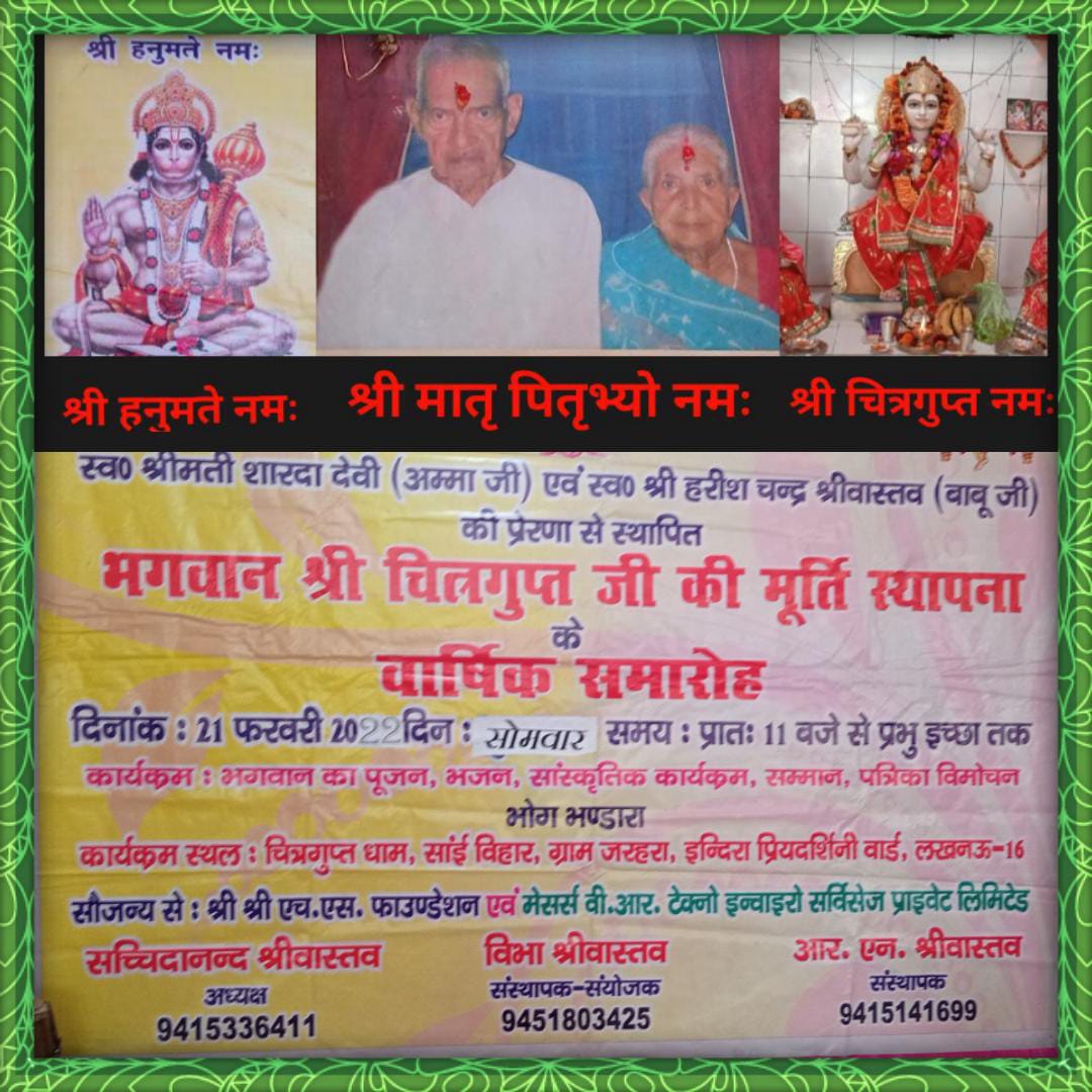 लखनऊ। श्री चित्रगुप्त मंदिर का पांचवा स्थापना दिवस समारोह संपन्न हुआ। इस अवसर पर संस्थापक / सचिव आर एन श्रीवास्तव, अध्यक्ष सच्चिदानंद, उपाध्यक्ष विभा श्रीवास्तव, कोषाध्यक्ष राखी श्रीवास्तव, सदस्य राम अवतार सिंह, सदस्य मनोज श्रीवास्तव, सदस्य देश दीपक श्रीवास्तव, सदस्य आशीष श्रीवास्तव, सदस्य पुनीत श्रीवास्तव एवं मार्गदर्शक मंडल में पंडित एपी चतुर्वेदी, एसके सिन्हा, एसपी मदन पांडे, एस एन श्रीवास्तव ,मदन श्रीवास्तव एवं कार्यक्रम का क्रियान्वयन श्रीमती विभा श्रीवास्तव, श्रीमती ज्योति श्रीवास्तव, श्रीमती मधु श्रीवास्तव ने किया। इस अवसर पर अखिल भारत हिंदू महा सभा के महानगर अध्यक्ष प्रकाश श्रीवास्तव ने मतदाताओं से अधिक से अधिक संख्या में मतदान करने की अपील की।