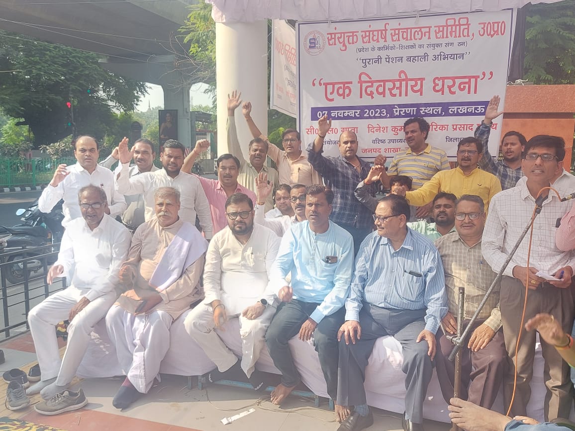 लखनऊ। संयुक्त संघर्ष संचालन समिति (5-4), उ० प्र० के पुरानी पेंशन बहाली के द्वितीय चरण के तहत राजधानी लखनऊ की शाखा ने कर्मचारियों के मसीहा स्व. बी. एन. सिंह की प्रतिमा के सम्मुख जिलाधिकारी आवास के सामने हजरतगंज लखनऊ में धरना दिया। और संयुक्त संघर्ष संचालन समिति उ प्र (एस-4) की और से उत्तर प्रदेशराज्य के कार्मिकों – शिक्षकों के लिए पुरानी पेंशन बहाली एवं समाप्त किये भत्तों की बहाली सहित अन्य लंबित मांगों ” की पूर्ति कराने हेतु जिलाधिकारी लखनऊ के माध्यम से महामहिम राज्यपाल उत्तर प्रदेश एवं मुख्यमंत्री जी को ज्ञापन एस-4 के जिला अध्यक्ष द्वारिका प्रसाद पांडेय, संयोजक सी० एल० गुप्ता व वरिष्ठ उपाध्यक्ष दिनेश कुमार, वरिष्ठ उपाध्यक्ष विनय कुमार सिंह, महासचिव आर के निगम, उपाध्यक्ष राजेश कुमार सिंह, संयुक्त संयोजक आर0 के0 वर्मा एवम् कृतार्थ सिंह राज्य कर्मचारी संयुक्त परिषद उ0प्र0 के प्रांतीय अध्यक्ष अरविंद कुमार वर्मा, उपध्यक्ष जे०के० सचान, वित्त मंत्री महेंद्र प्रताप सिंह, संप्रेक्षक नागेंद्र भूषण पांडेय, मिनिस्ट्रियल एसोसिएशन इरिगेशन डिपार्टमेंट यूपी के महामंत्री गोवर्धन जी, कार्यालय सचिव राम गुप्ता, जिलाध्यक्ष चमनलाल भारती. पी एस पी एस ए की प्रांतीय महामंत्री आशुतोष मिश्रा, एस 4 के प्रांतीय मीडिया प्रभारी मनोज यादव, राम प्रकाश यादव, प्रदुम्न सिंह, राजीव गुप्ता, कुंदन सैनी, प्रीती सैनी, ज्ञानेंद्र शंकर त्रिपाठी, राकेश कुमार चतुर्वेदी, अनुराग सिंह, पीयूष त्रिपाठी, अमोद शर्मा की उपस्थित में दिया गया। धरने की अध्यक्षता द्वारिका प्रसाद पाण्डेय ने की एवं मंच का संचालन सी एल गुप्ता ने की।