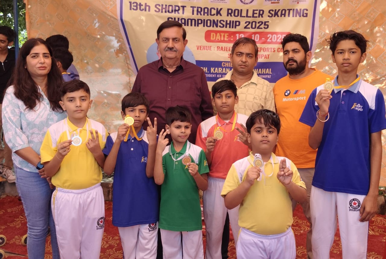 बागपत। विवेक जैन। सेंट एंजेल्स के प्रतिभाशाली खिलाड़ी वैभव, कार्तिक, रेयान, अनंत, असद व प्रियश ने हरियाणा के सोनीपत में स्थित राजीव गांधी स्पोर्ट्स कांप्लेक्स में 12 अक्टूबर 2025 को संपन्न हुई 13वीं शॉर्ट ट्रैक इंटर स्कूल रोलर स्केटिंग चैंपियनशिप 2025 में 3 गोल्ड व 3 सिल्वर मेडल जीतकर नया कीर्तिमान स्थापित किया। रोलर स्केटिंग चैंपियनशिप में अंडर- 12 आयु वर्ग के बालक वर्ग में 300 मी स्केटिंग रेस प्रतियोगिता में वैभव ने गोल्ड मेडल प्राप्त किया। अंडर-10 आयु वर्ग के बालक वर्ग में 300 मी॰ स्केटिंग रेस में कार्तिक ने गोल्ड मेडल प्राप्त किया। अंडर- 8 आयु वर्ग के बालक वर्ग में 200 मी स्केटिंग रेस में रेयान ने गोल्ड मेडल व अनंत ने सिल्वर मेडल प्राप्त किया। अंडर-6 आयु वर्ग के बालक वर्ग में 200 मी स्केटिंग रेस में असद ने सिल्वर मेडल प्राप्त किया। अंडर- 4 आयु वर्ग के बालक वर्ग में 200 मी स्केटिंग रेस स्पर्धा में प्रियश ने सिल्वर मेडल प्राप्त किया। स्कूल पहुंचने पर विजेता खिलाड़ियों का भव्य स्वागत किया गया। स्कूल प्रबंधक अजय गोयल ने स्केटिंग चैंपियनशिप में स्कूल व जनपद का नाम रोशन करने वाले सभी विजेता खिलाड़ियों को बधाई दी एवं उनके उज्जवल भविष्य की कामना की। इस अवसर पर अजीत, राजीव, बबलेश, अक्षय, कृष्णा, गौरव, आदित्य, दीपक आदि शिक्षक उपस्थित रहे |