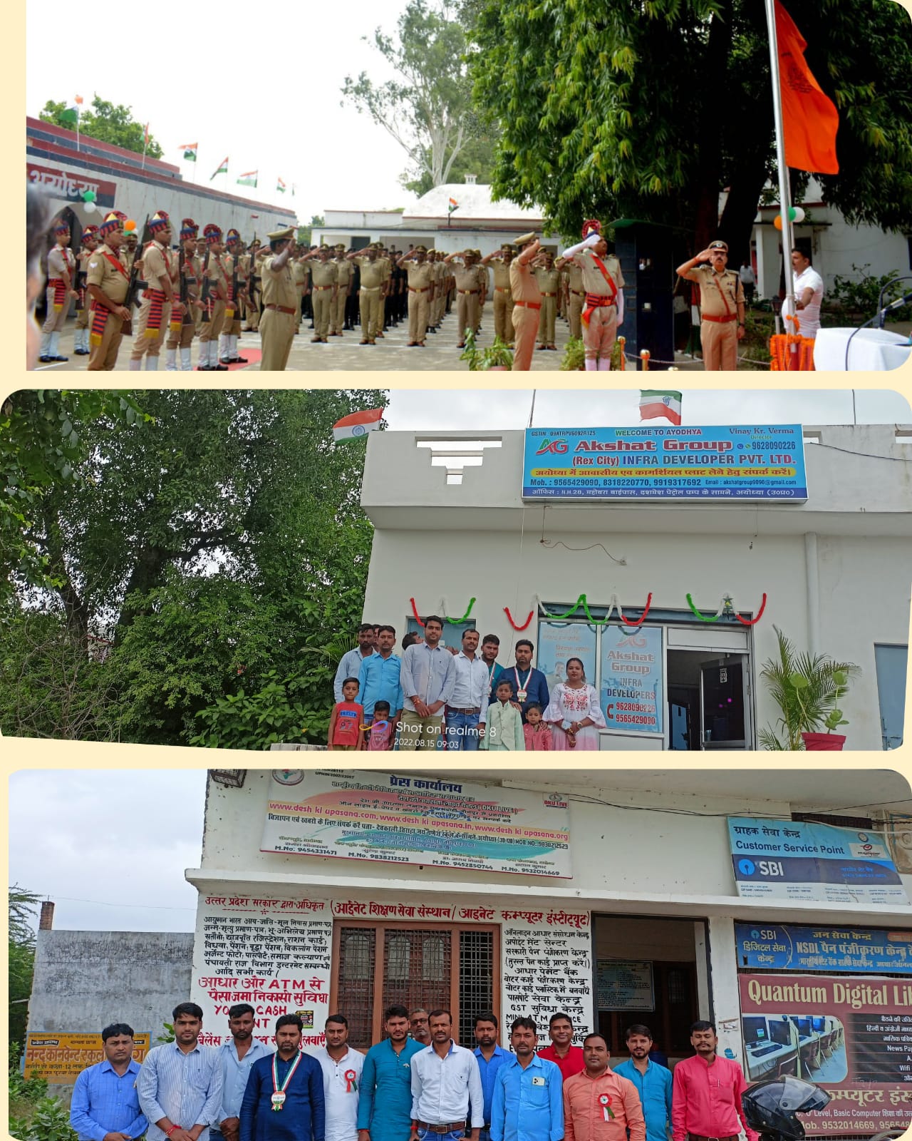 अयोध्या (संवाददाता) सुरेंद्र कुमार।स्वाधीनता दिवस की 75 वीं वर्षगांठ पर अमृत महोत्सव के अंतर्गत अयोध्या शहर एवं ग्रामीण क्षेत्रों में तिरंगा लहरा कर झंडे का सम्मान करके अमृत महोत्सव के रूप में स्वतंत्रता दिवस मनाया गया जिसमें सभी सरकारी कार्यालय प्रशासनिक कार्यालय और प्राइवेट कार्यालय पर ध्वजारोहण का कार्यक्रम सम्मान पूर्वक संपन्न किया गया। अयोध्या के एस एस पी प्रशांत वर्मा ने स्वतंत्र दिवस की शुभकामनाएं सभी भारतवासी और अयोध्यावासी को दी। और बताया कि इस बार जो राष्ट्र भक्ति का प्रेम लोगों में दिख रहा है वह बहुत ही मनमोहक दृश्य था।सभी संप्रदायों ने अपना मजहब छोड़कर राष्ट्रभक्ति के प्रति प्रेम की भावना को उजागर किया है। इसी कड़ी में अक्षत ग्रुप इंफ्रा डेवलपर्स प्राइवेट लिमिटेड के डायरेक्टर विनय कुमार वर्मा ने सभी देशवासी और अयोध्यावासी को स्वतंत्रता दिवस की हार्दिक शुभकामनाएं दी और अपने कार्यालय पर ध्वजारोहण कर देश के प्रति सम्मान व्यक्त किया और कहा आजादी के वीर सपूतों को भावभीनी श्रद्धांजलि अर्पित करते हुए वक्ताओं ने एक दूसरी आजादी के लिए छुआछूत,वर्गभेद, रंगभेद,वर्णभेद व सामाजिक विषमताओं पर चिंता व्यक्त करते हुए समाज को जागरूक करने की आवश्यकता बताई तथा आपस में मिलजुल कर रहने भाईचारा व सद्भाव पूर्ण वातावरण स्थापित कर देश की प्रगति में अपना पूर्ण सहयोग प्रदान करने का संकल्प लिया।