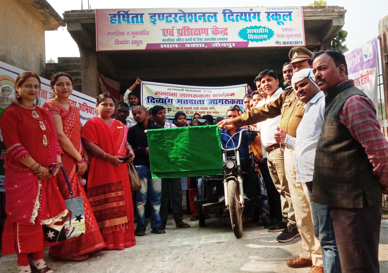 वरी 2022 को हर्षिता इंटरनेशनल दिव्यांग स्कूल बक्शा व राजेश स्नेह ट्रस्ट ऑफ एजुकेशन दिव्यांग हेतु स्कूल एवं पुनर्वास केंद्र के संयुक्त तत्वाधान में दिव्यांग मतदाता जागरूकता रैली निकाली गयी जिसको एस. आई. बक्सा श्री अवधेश नारायण शुक्ल जी व जेसीआई अध्यक्ष अभिलाषा श्रीवास्तव ने हरी झंडी दिखा कर रवाना किया। रैली में दिव्यांग जनों ने खूब बढ़ चढ़ कर हिस्सा लिया। जनपद के सक्रिय सामाजिक कार्यकर्ता और जिला दिव्यांग मतदाता कोऑर्डिनेटर राजेश कुमार ने बताया कि सरकार द्वारा इस बार दिव्यांग व्यक्तियों को उनके घर पर ही वोट देने की ब्यवस्था की गयी है बूथ पर दिव्यांग जनों को लाइन लगाने की जरूरत नहीं है