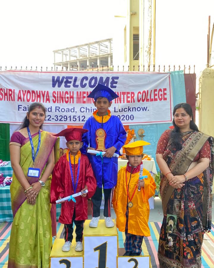 लखनऊ। चिनहट स्थित श्री अयोध्या सिंह मेमोरियल इंटर कॉलेज के प्रांगण में ग्रेजुएशन सेरेमनी ( दीक्षांत समारोह) का आयोजन किया गया। कार्यक्रम की शुरुआत विद्यालय की प्रबंधक शैल सिंह प्रधानाचार्या पूजा सिंह ने मां सरस्वती की प्रतिमा के समक्ष दीप प्रज्वलन एवं पुष्पांजलि अर्पित कर की।कार्यक्रम के दौरान विद्यालय की प्रबंधक एवम प्रधानाचार्य के द्वारा प्रत्येक कक्षा के टॉप रैंकर्स को ट्रॉफी, मैडल, सर्टिफिकेट एवं गिफ्ट दिए गए। साथ ही कक्षा 6 की छात्रा रोशनी यादव को शत प्रतिशत उपस्थिति के लिए सम्मानित किया गया। हर कक्षा के बेस्ट मॉनिटर को भी सम्मानित किया गया। बच्चों के एकेडमिक रिकॉर्ड और एक्टिविटीज को देखते हुए प्री प्राइमरी सेक्शन से यूकेजी की अनन्या वर्मा, प्राइमरी सेक्शन से कक्षा 1 की मान्या, जूनियर सेक्शन से कक्षा 8 की शगुन विश्वकर्मा एवं सीनियर सेक्शन से कक्षा 11 के बाल कृष्ण द्विवेदी एवं प्राची वर्मा को एक्टिविटी स्टार का खिताब दिया गया।