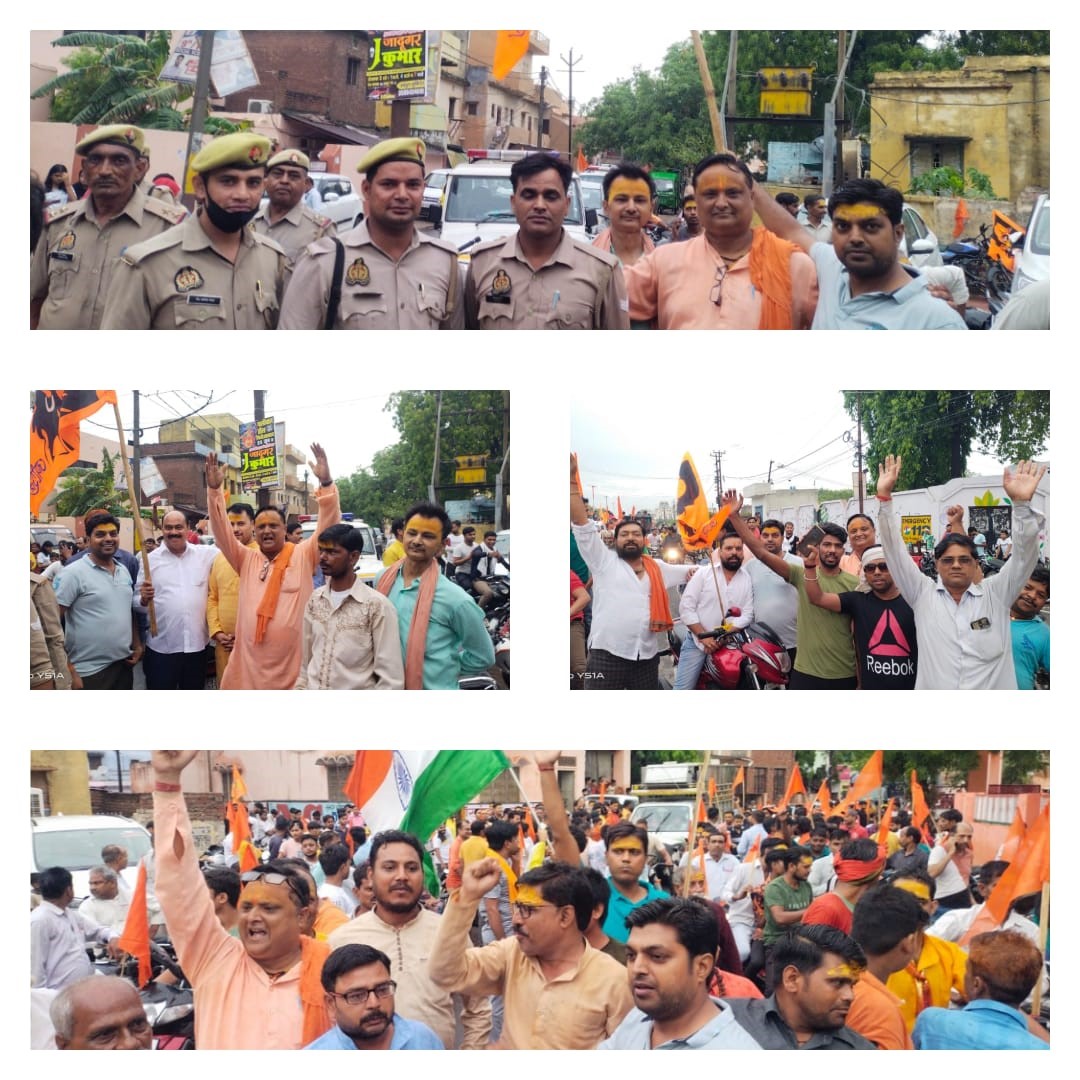 फिरोजाबाद। हिंदू राष्ट्र बनाए जाने की मुहिम में चंद्र नगर फिरोजाबाद में निकाली गई भगवा यात्रा में राष्ट्रीय युवा वाहिनी गौ प्रकोष्ठ ने की सहभागिता