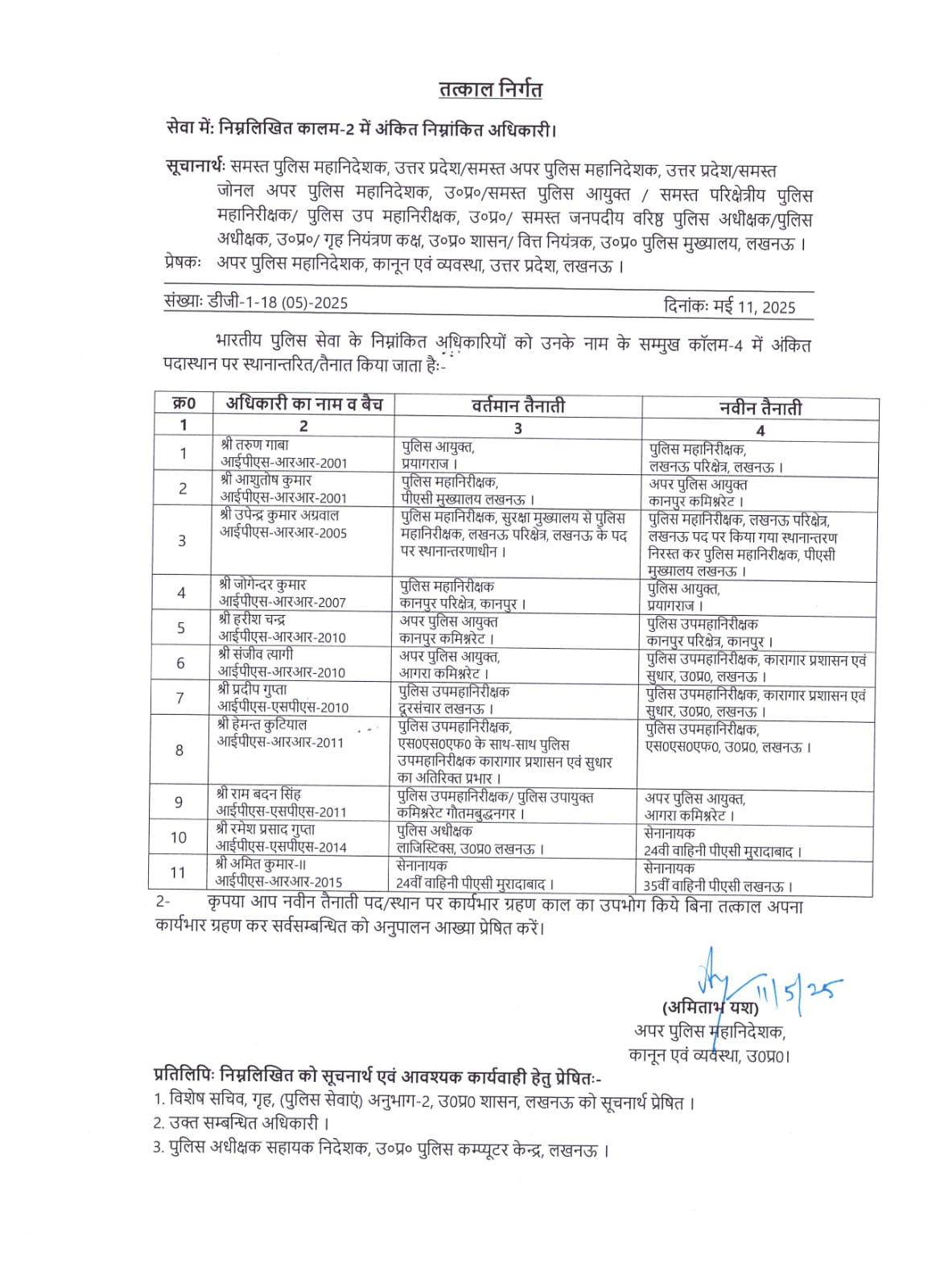 लखनऊ: उतर प्रदेश शासन माननीय मुख्यमंत्री योगी आदित्यनाथ जी द्वारा प्रशाशन को चुस्त दुरुस्त बनाए रखने के लिए प्रदेश के 11 वरिष्ठ आईपीएस अफसरों का तबादला कर किया गया देखिए पूरी लिस्ट