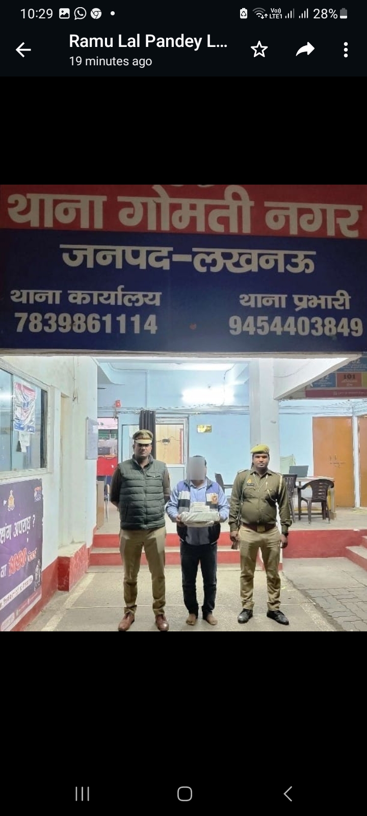 लखनऊ। पुलिस आयुक्त एस0बी0 शिरडकर जनपद लखनऊ व अभियुक्तों की गिरफ्तारी हेतु चलाये जा रहे अभियान के क्रम में पुलिस उप आयुक्त (पूर्वी) आशीष श्रीवास्तव व अपर पुलिस उप आयुक्त (पूर्वी) सय्यद अली अब्बास व सहायक पुलिस आयुक्त गोमतीनगर स्वाति चौधरी के पर्यवेक्षण एवं प्रभारी निरीक्षक थाना गोमती नगर दीपक कुमार पाण्डेय के निर्देशन में थाना गोमती नगर पुलिस टीम द्वारा घटना कारित होने के 24 घंटे के अन्दर CCTV कैमरों की मदद से व मुखबिर की मदद से एवं अन्य सम्भावित माध्यमों का उपयोग करते हुए 01 नफर शातिर लूटेरा व चोर राजकुमार राजपूत पुत्र स्व० मैकूलाल निवासी म०नं0 529/409 (762) नई बस्ती रहीमनगर थाना महानगर जनपद लखनऊ उम्र 36 वर्ष को विनीतखण्ड सब्जीमण्डी से ग्वारी चौराहा मार्ग में निकट ग्वारी चौराहा ओवरब्रिज के पास थाना गोमतीनगर से गिरफ्तारी करने में सफलता प्राप्त हुई।