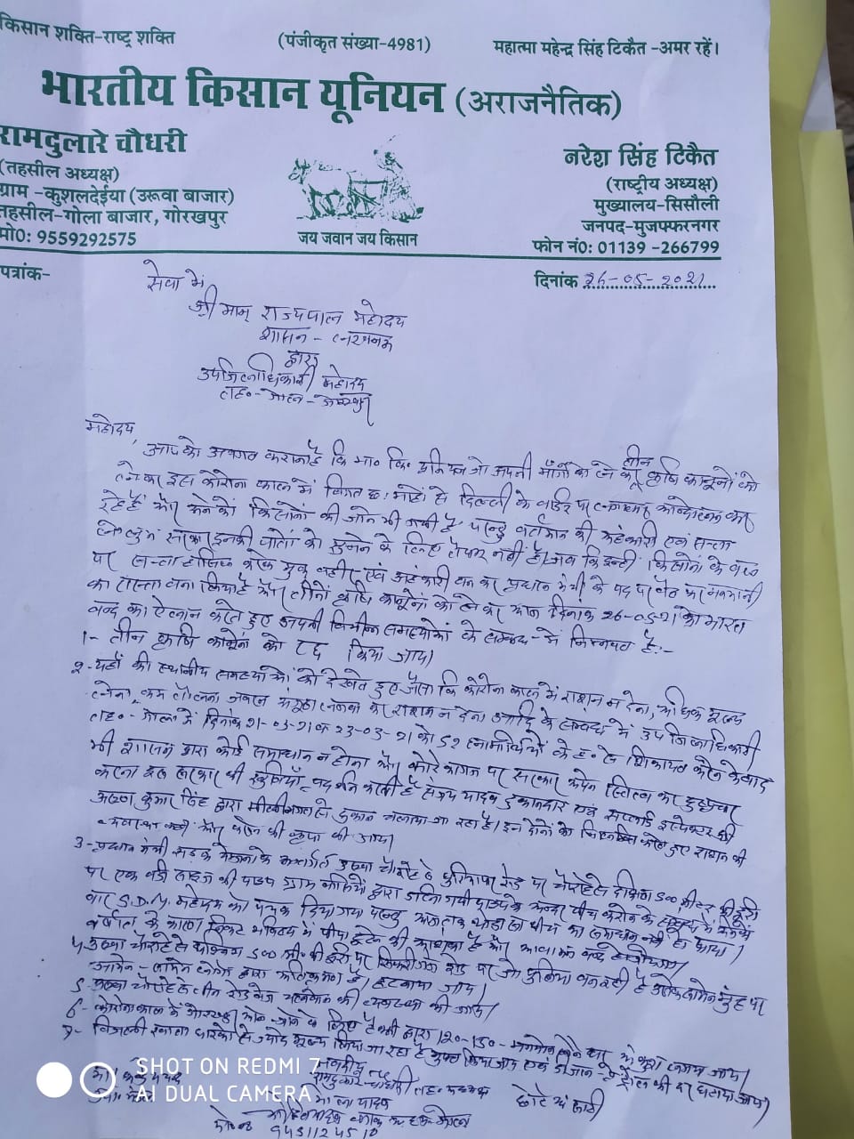 गोरखपुर मंडल प्रतिनिधि के अनुसार भारतीय किसान यूनियन के तहसील अध्यक्ष राम दुलारे चौधरी के नेतृत्व में किसानों ने तीनों काले कृषि कानून को खत्म करने और सरकार से सात सूत्रीय ज्ञापन उप जिलाधिकारी गोला को सौंपा किसान नेता ने मांग पत्र में कई दिनों से कृषि विधेयक 2020 जो किसानों के लिए काले कानून के बराबर है जिसको लेकर किसान संगठन आंदोलन पर बैठे हैं सरकार के द्वारा अभी तक किसानों की मांगों को मानने मैं विलंब किया जा रहा है कानून किसान संगठनों से विचार-विमर्श करके ही बननी चाहिए ताकि किसान और सरकार के बीच पारदर्शिता बनी रहे सरकार को जबरन अपना कानून थोपना किसानों के साथ घोर अन्याय है। जिसको देश का किसान कभी स्वीकार नहीं करेगा। इन सब मांगों को लेकर किसानों ने आज काला दिवस मनाया। जिसको लेकर गोला प्रशासन सतर्क रहा