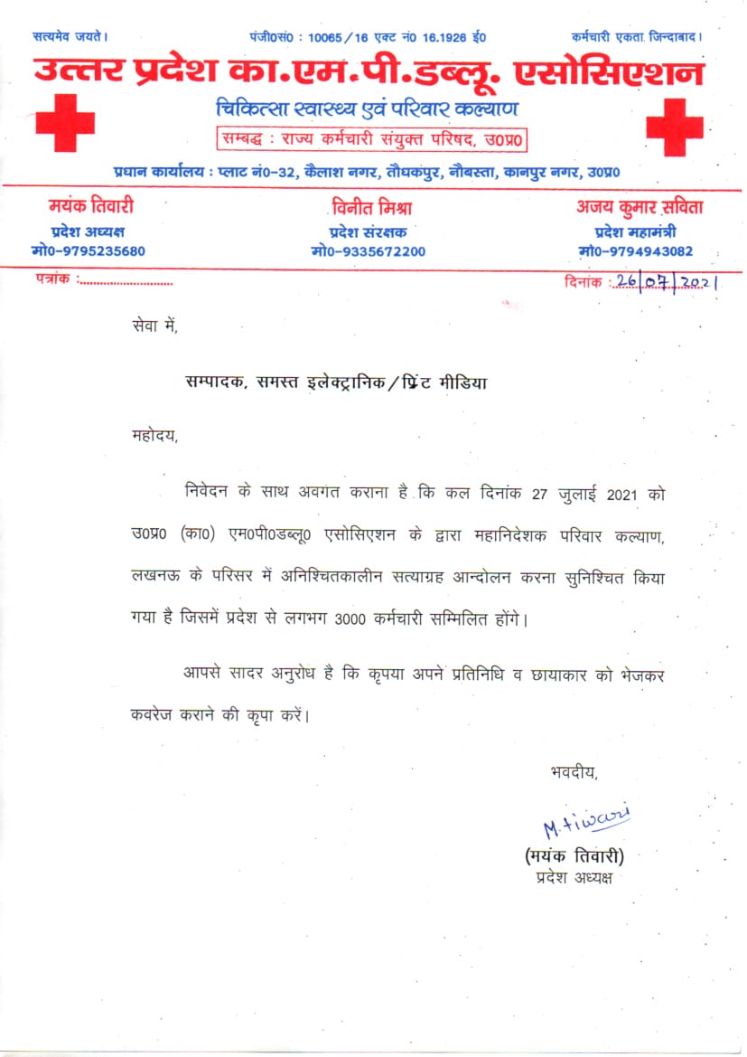 वर्तमान समय में कोविड-19 एक भयंकर संक्रामक बीमारी है मानव संपदा के अभाव में देश प्रदेश में भयंकर समस्याओं सहित जन हानि का सामना करना पड़ा है माननीय उच्च न्यायालय प्रधानमंत्री जी तथा स्वास्थ्य विशेषज्ञों ने समय-समय पर मानव संपदा की कमी को दूर करने के लिए ग्रेजुएट पास युवाओं को 3 सप्ताह का प्रशिक्षण देकर उनको स्वास्थ्य विभाग में भर्ती करने का निर्देश सुझाव दिया है इन कार्मिकों ने 3 वर्षों से अधिक समय तक हाई रिस्क एरिया में यही कार्य किया है जिला स्वास्थ्य समिति द्वारा मेरिट के आधार पर चयनित हैं संक्रामक बीमारियों एवं कोविड-19 की वर्तमान परिस्थितियों के दृष्टिगत इनकी कार्य दक्षता हाई रिस्क एरिया में कार्य करने का अनुभव महानिदेशक परिवार कल्याण उत्तर प्रदेश की प्रशिक्षण हेतु की गई प्रबल संस्तुति की है।उ प्र (का) एम पी डब्ल्यू एसोसिऐशन के संरक्षक विनीत मिश्रा ने बताया कि महानिदेशक परिवार कल्याण महानिदेशालय में राज्य कर्मचारी संयुक्त परिषद के प्रदेश अध्यक्ष श्री सुरेश रावत जी महामंत्री श्री अतुल मिश्रा जी उपाध्यक्ष श्री धनंजय तिवारी जी सचिव डॉ पी के सिंह तथा उ प्र बेसिक हेल्थ वर्कर्स एशोसियेशन के महामंत्री शिवसागर शुक्ल की उपस्थिति में प्रदेश के 40 जिलों से 3500 संविदा एमपीडब्ल्यू महानिदेशक परिवार कल्याण परिसर में अपने प्रशिक्षण की मांग को लेकर अनिश्चितकालीन सत्याग्रह आंदोलन शुरू करेंगे।