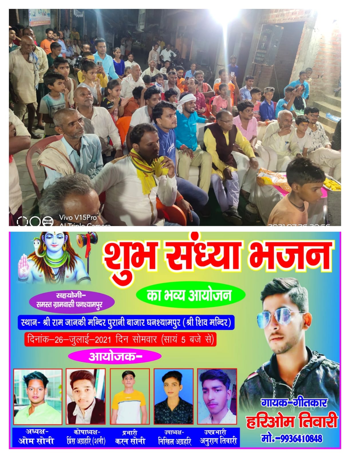 बदलापुर जौनपुर) घनश्यामपुर पुरानी बाजार राम जानकी मंदिर शुभ संध्या भजन का भव्य आयोजन किया गया। जिसमेंगीतकार-गायक हरिओम तिवारी ने भक्ति गीत गाकर श्रोताओं को मंत्रमुग्ध कर दिया। जिसमें सावन मास के उपलक्ष्य में शिव की महिमा को अपने गीतों के माध्यम से सुनाया । लोगों ने भक्ति गीत को सुनकर खुब वाह वाही करते हुए उत्साह वर्धन किया। कार्य क्रम का आयोजक प्रभारी – करन सेठ ने किया। अध्यक्ष ओम सेठ ने आये हुए लोगों के प्रति आभार प्रकट किया।,उपाध्यक्ष निखिल अग्रहरी) (कोषा अध्यक्ष प्रिंस अग्रहरी )(उप प्रभारी अनुराग तिवारी ने मुख्य भूमिका निभाई। जिसमें मुख्यअतिथि के रूप में इंदु सिंह प्रदेश वरिष्ठ उपाध्यक्ष उद्योग व्यापार मंडल उत्तर प्रदेश , विशिष्ट अतिथि शिव प्रताप सिंह नाटे जिला पंचायत सदस्य ,राघवेंद्र सेठ ,अरविंद सेठ,लोलारख तिवारी कपड़ा वाले, सुरेंद्र सेठ ,विमल अग्रहरी, काजू अग्रहरी ग्राम के सभी सम्भ्रांत लोग उपस्थित रहे।